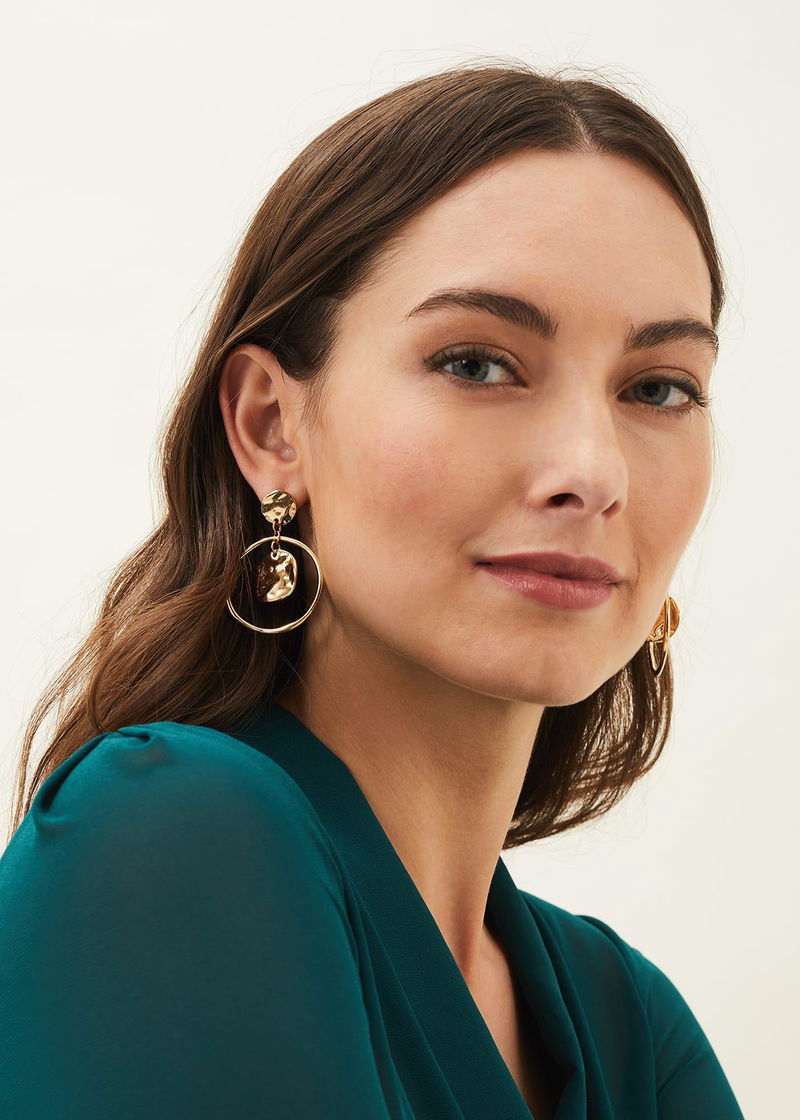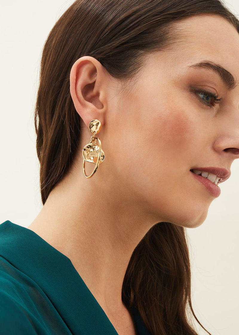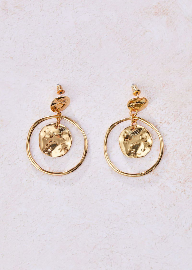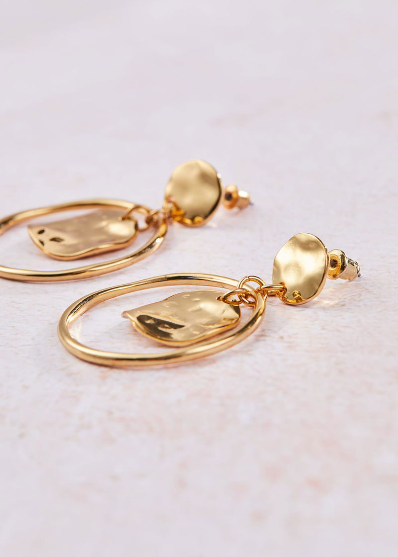 These striking gold plated earrings will add instant glamour to your looks. Featuring a double hammered disc and hoop design at the drop.