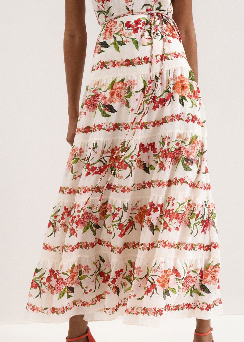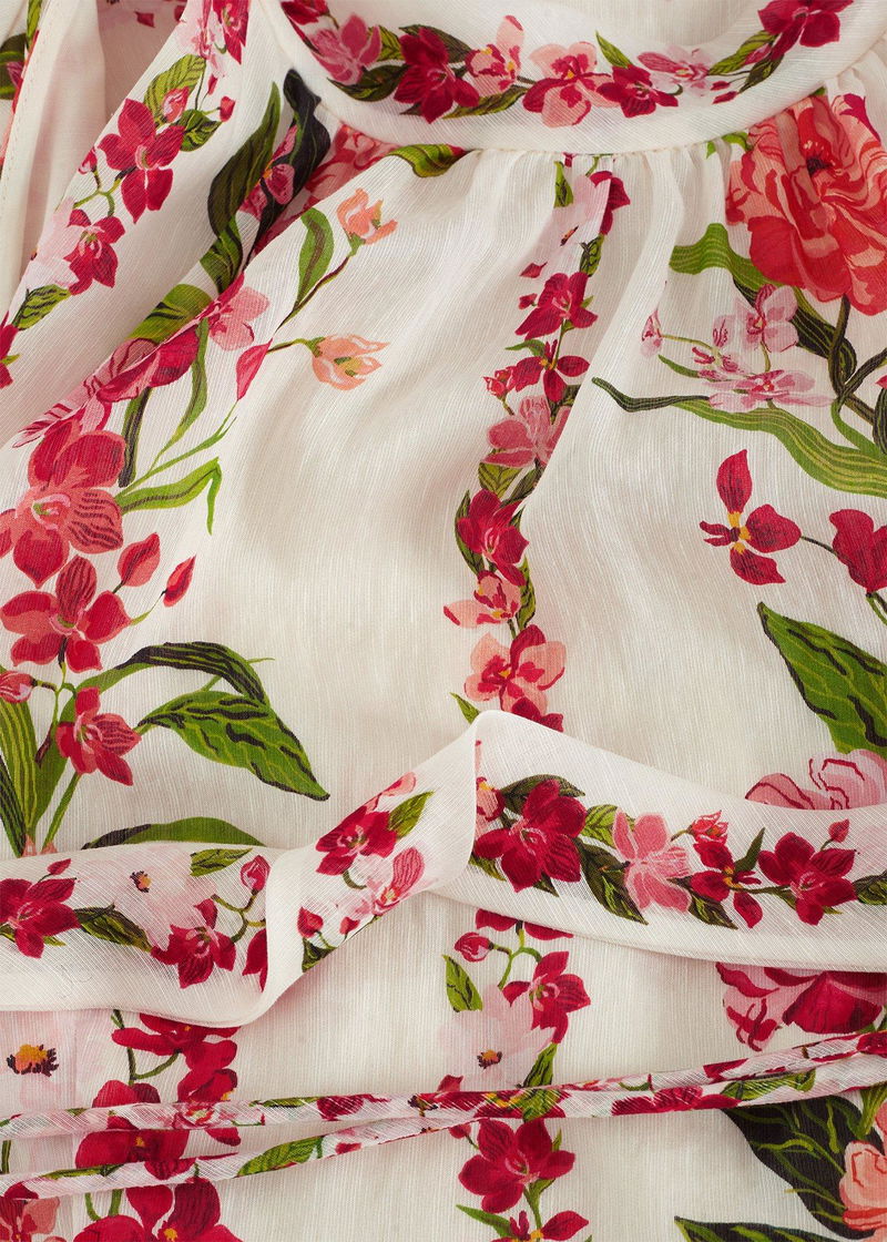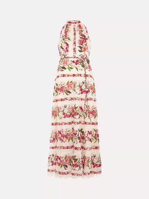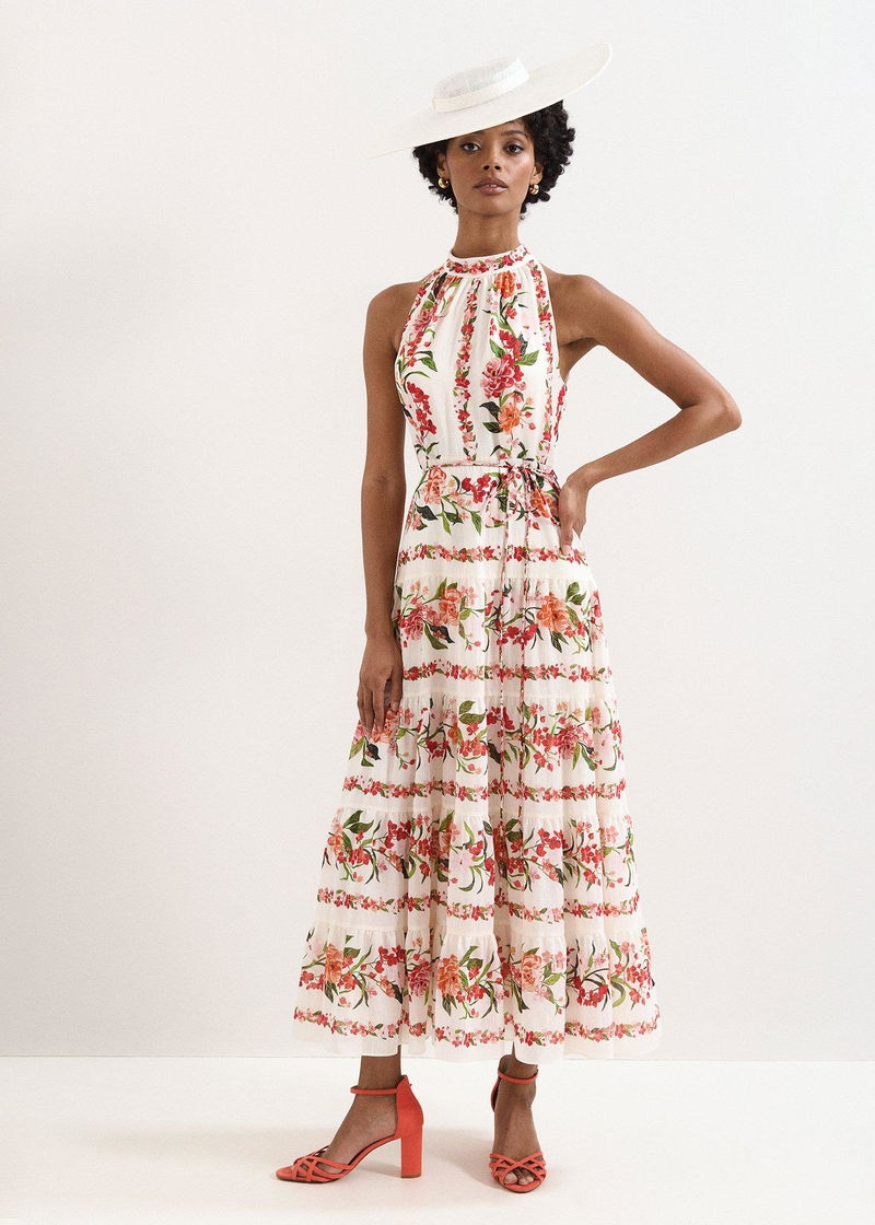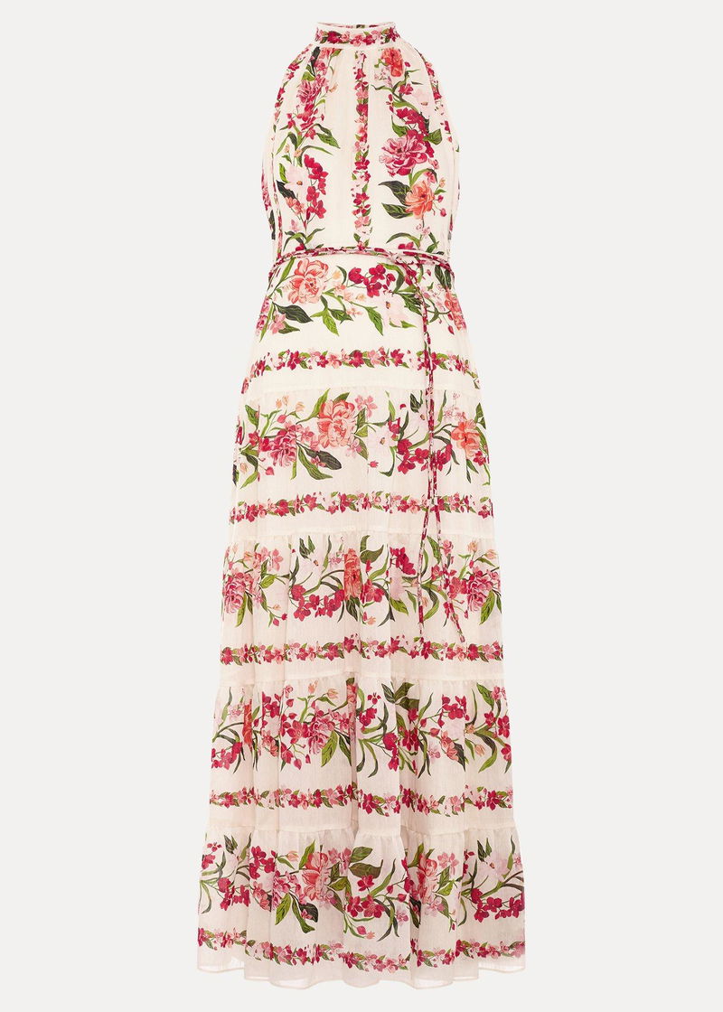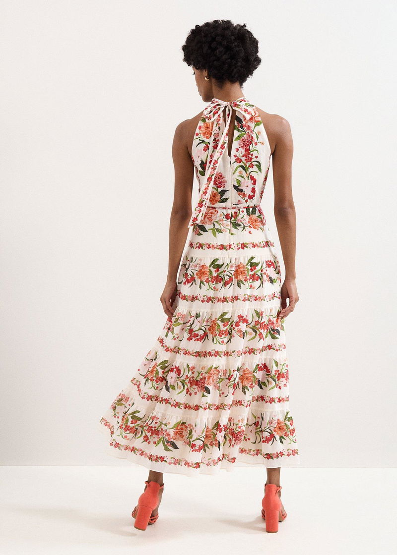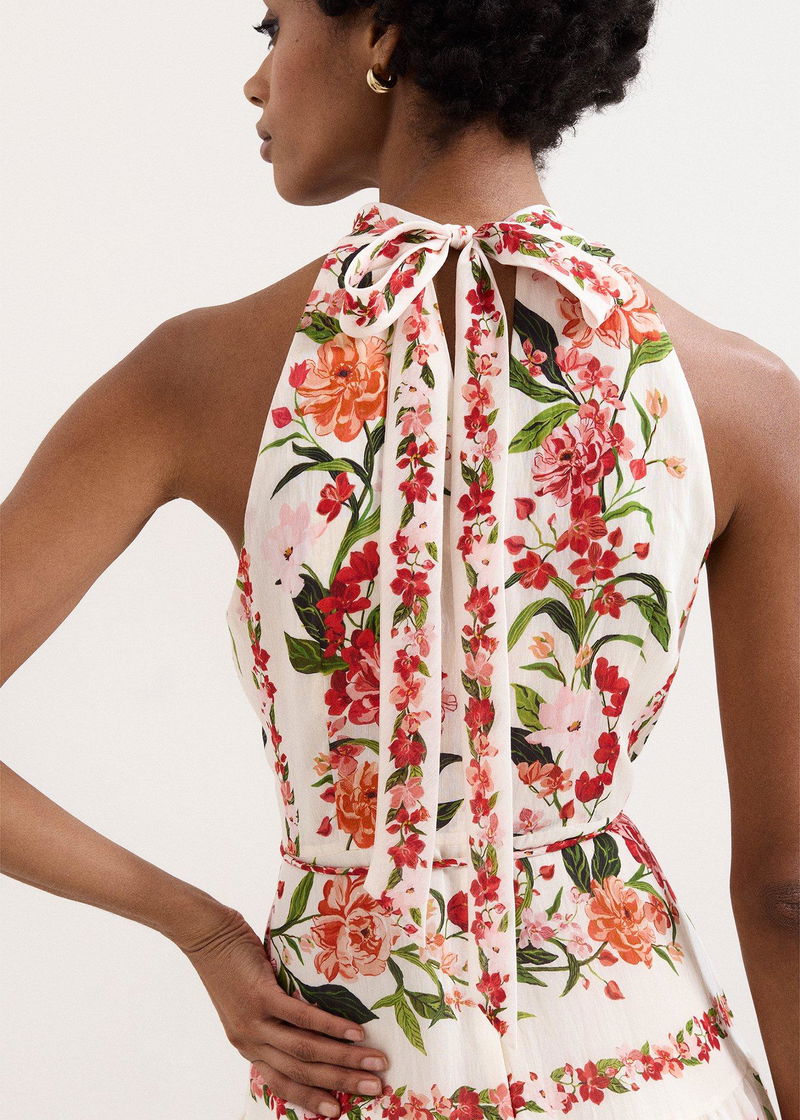fit An event dress that encapsulates the essence of spring. Designed in a beautiful halter neck silhouette, this romantic midi dress’ true allure is the hand-painted floral print inspired by 19th century botanical patterns. Modernised in striking colours, this dress is finished with a bow detail at the back and matching tie belt to enhance the silhouette. Wear with your favourite accessories to complete the look.