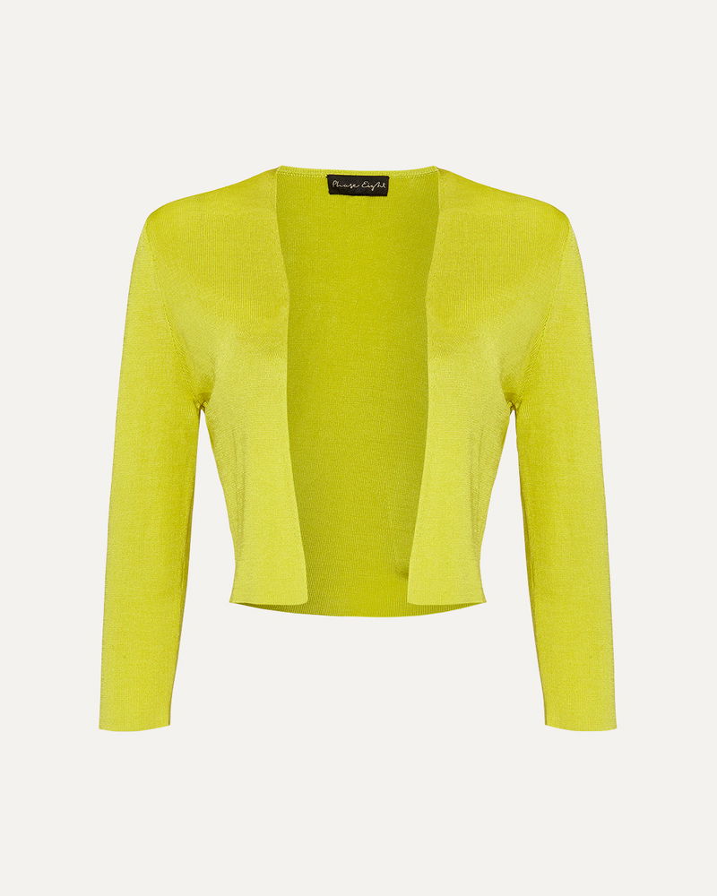 A smart structured jacket with an open front, pleats at the shoulder and 3/4 length sleeves. This cropped design is collarless and has a clean, boxy fit.
