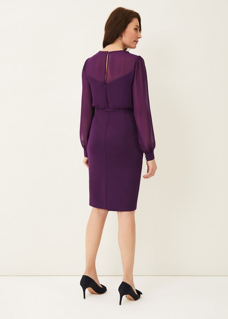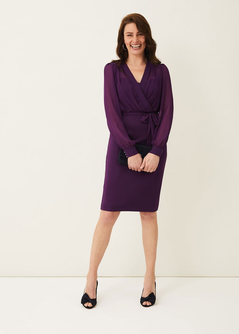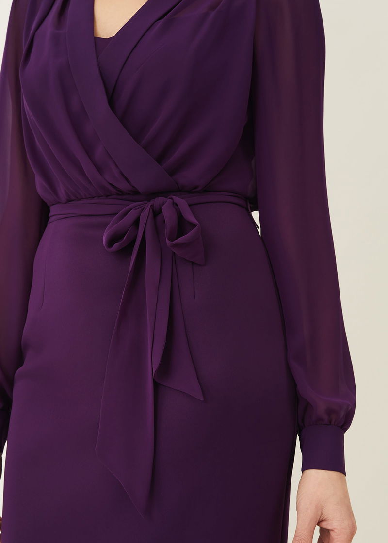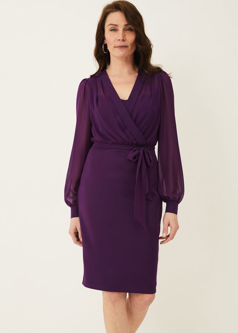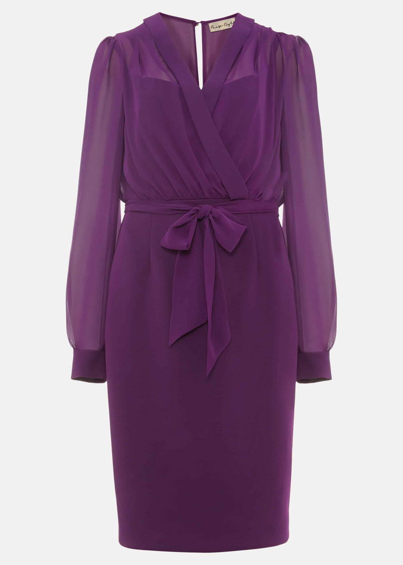 Ready for your autumn/winter plans, the Sian Dress is designed with a faux wrap bodice and statement sheer blouson sleeves. The bodice falls into a fitted scuba skirt with a split at the back. This style is finished with a matching waist tie to highlight your silhouette.