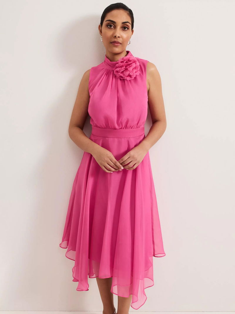 The best-selling Lucinda silhouette from Phase Eight in a new vibrant pink. A romantic floral applique highlights the elegant high neckline for a touch of sophistication. Flowing to a beautiful chiffon skirt for fluid movement. Style it with silver accessories for an effortless event look.