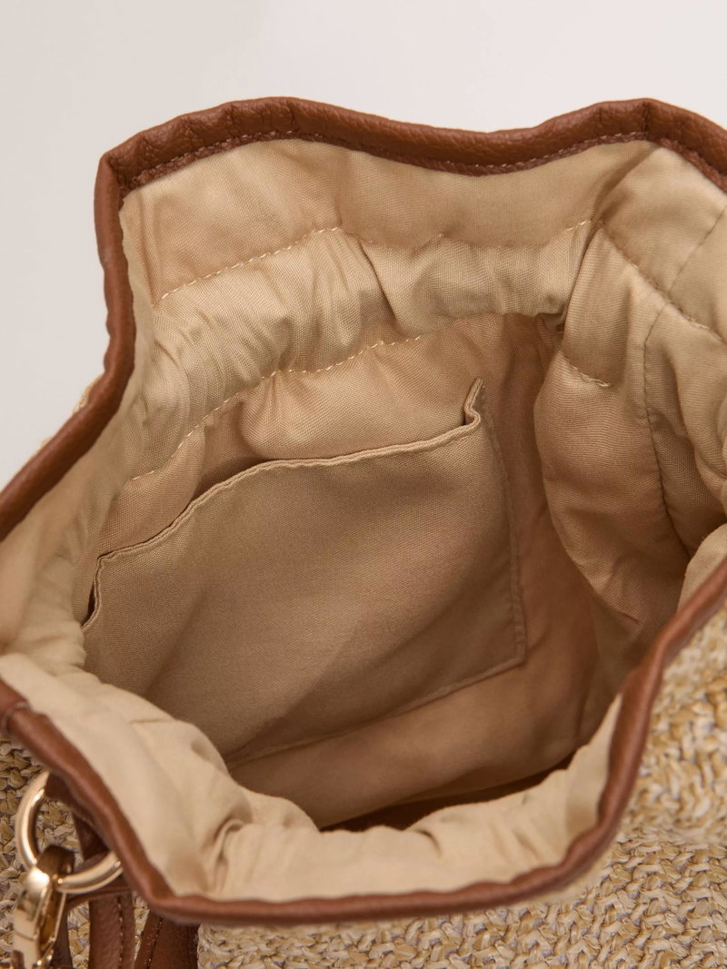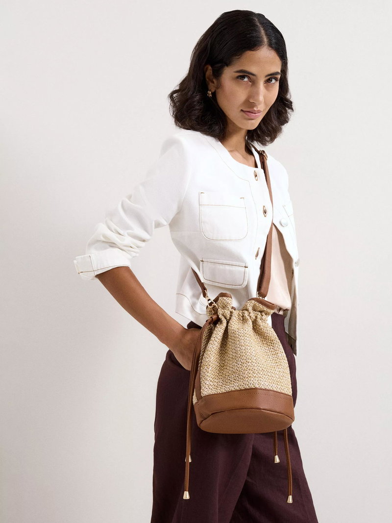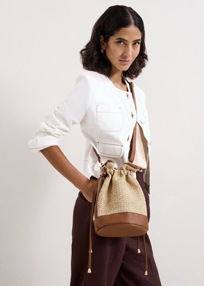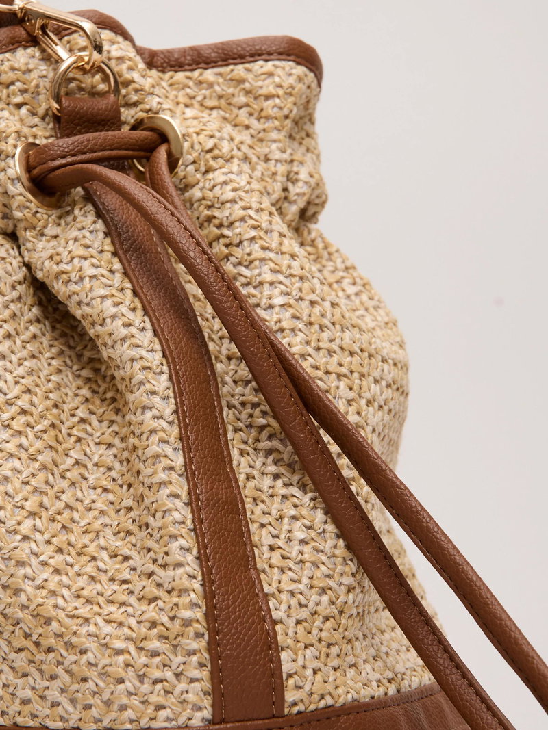 This straw bucket bag keeps essentials handy and is finished with a contrast faux leather trim. Its simple style suits your everyday plans, from coffee dates to quick errands, in just the right size to take anywhere.