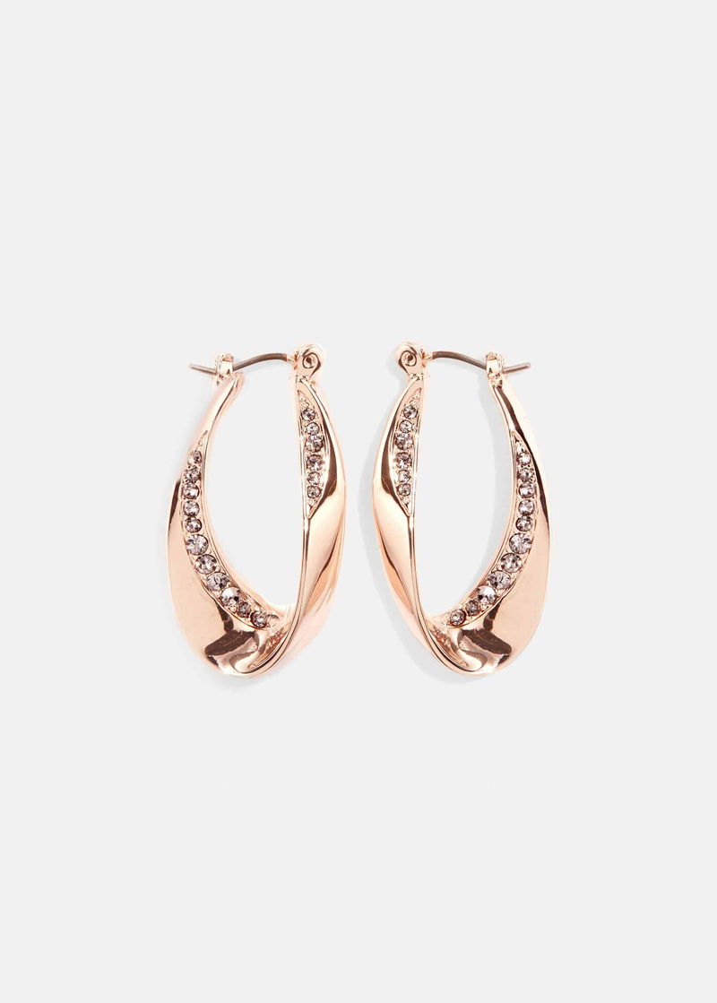 A modern hoop earring designed in an interlocking shape, encrusted with delicate diamantes.