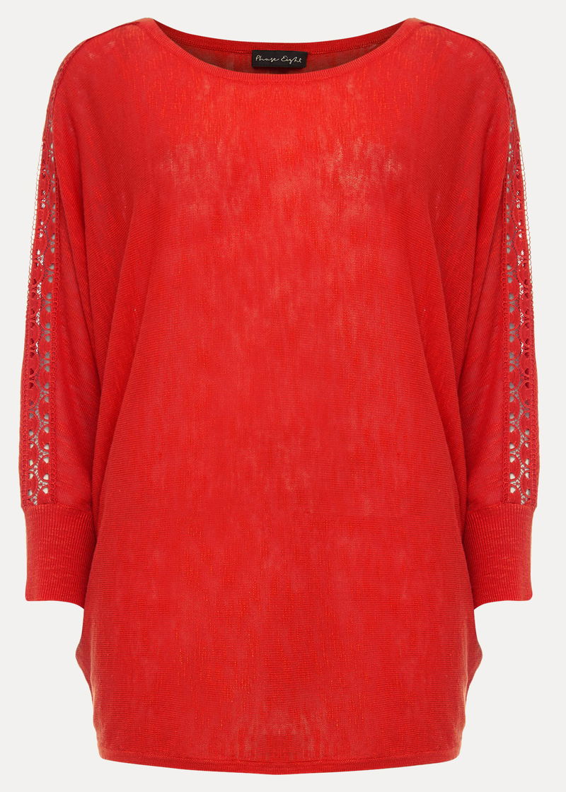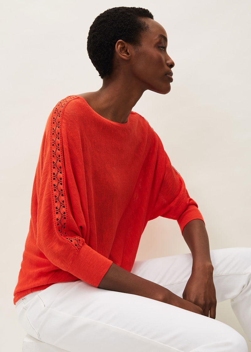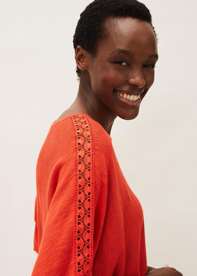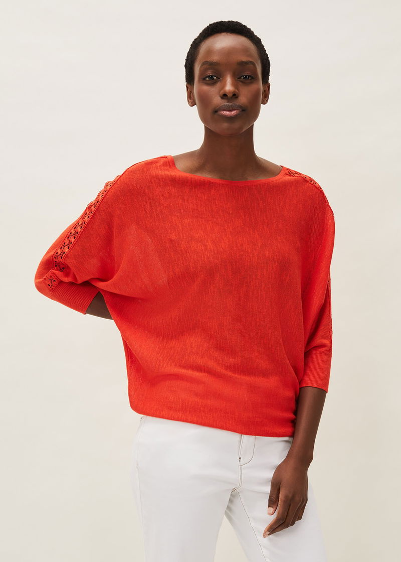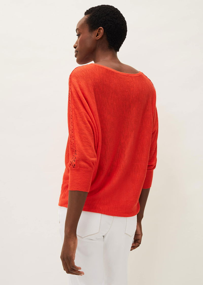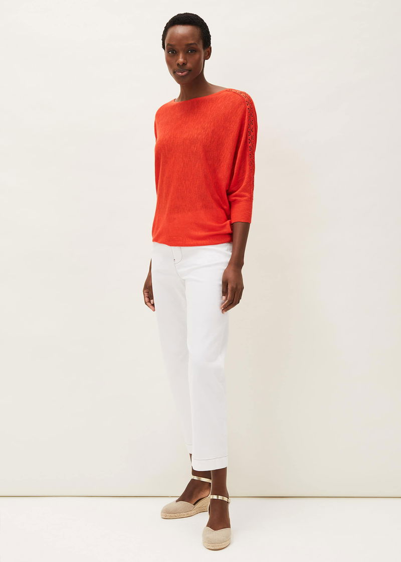 This easy linen rich top is designed with a boat neck and flattering 3/4 length sleeves. Lace trims detail the sleeves for added interest.