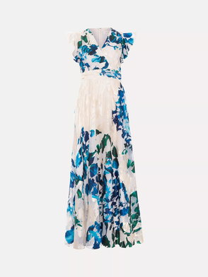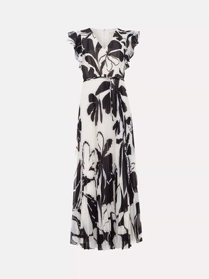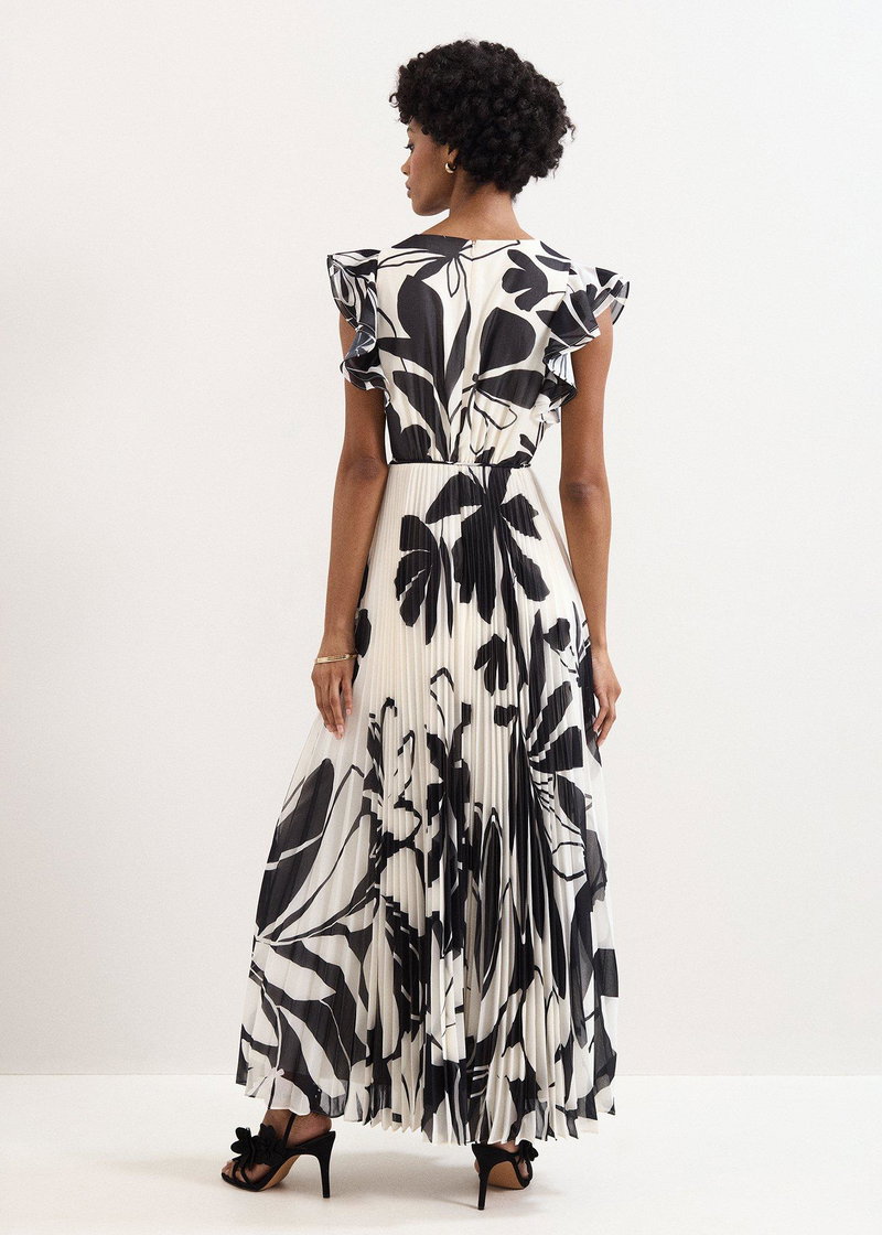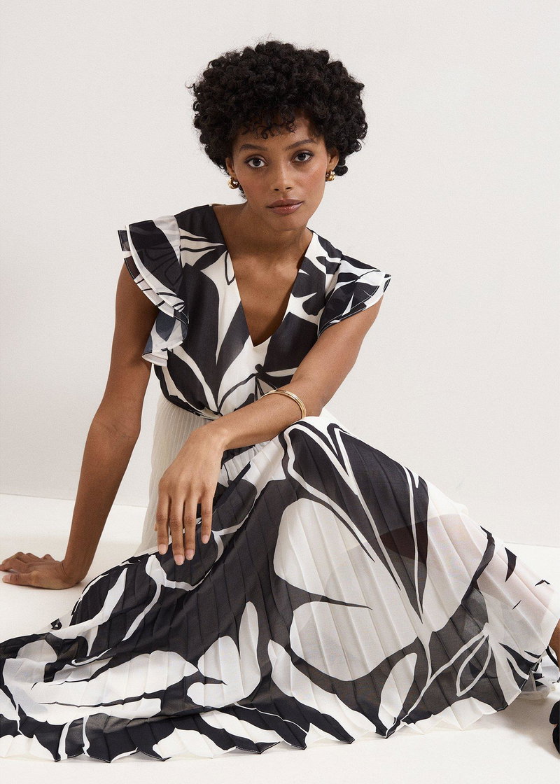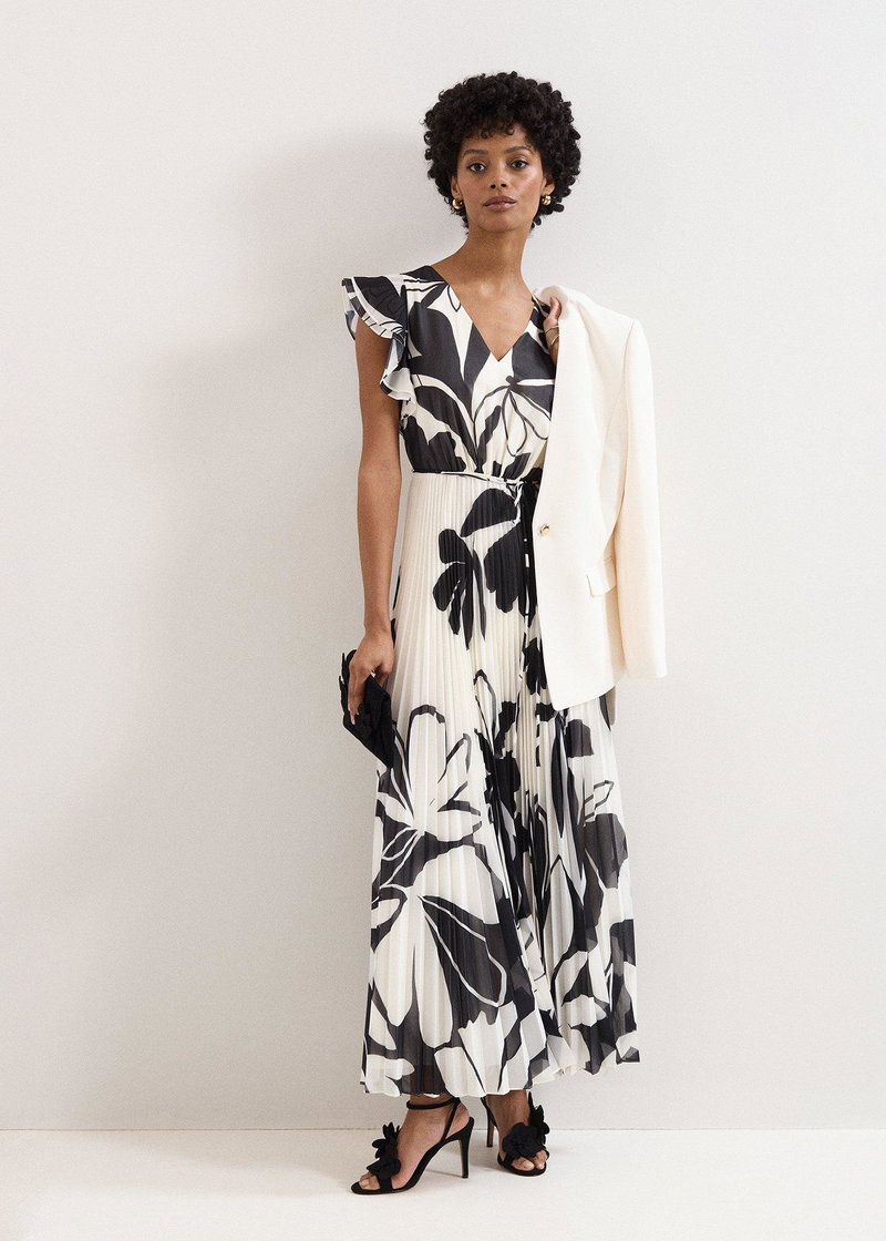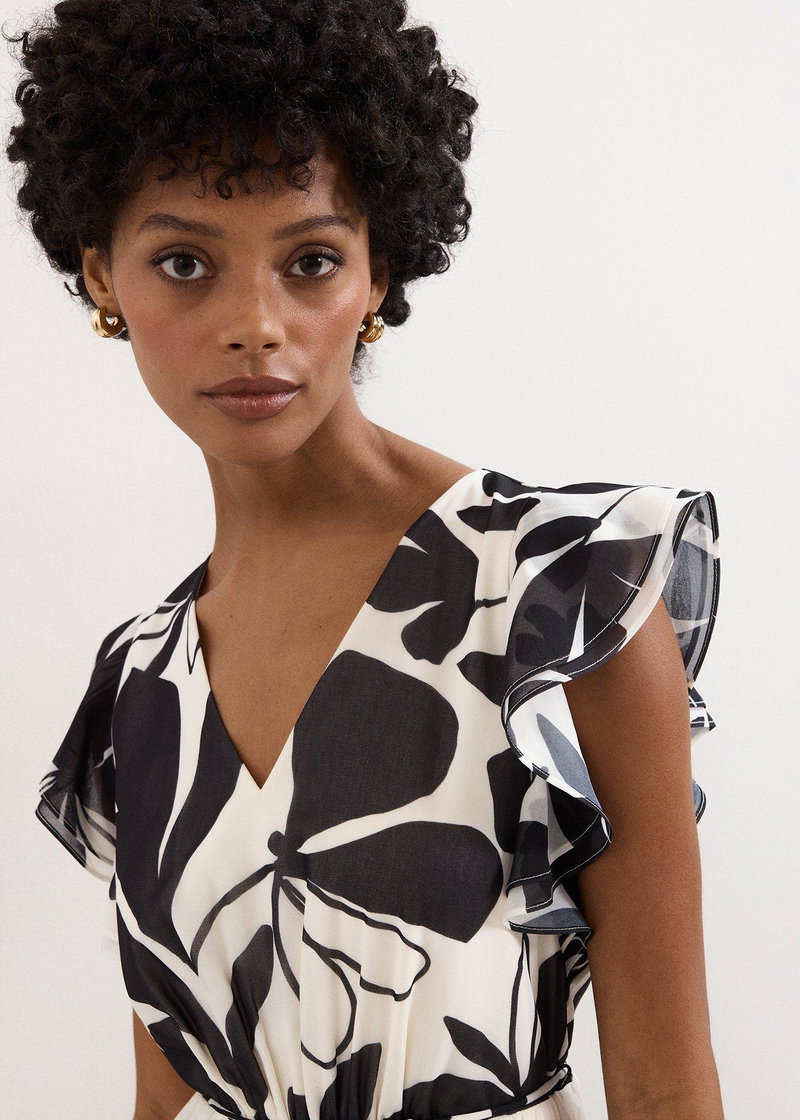 Looking for an event dress that transcends the seasons? Look no further. In a timeless black and ivory, this maxi dress features a feminine V neckline and frilled cap sleeves for a feminine touch.