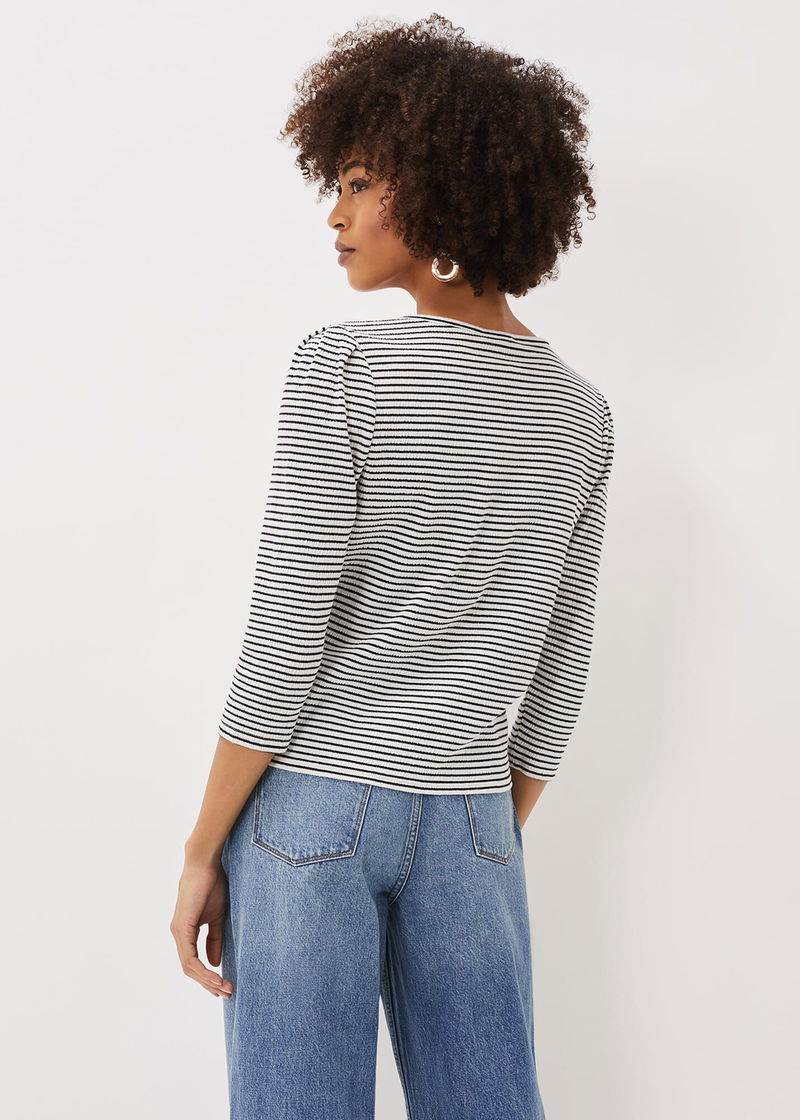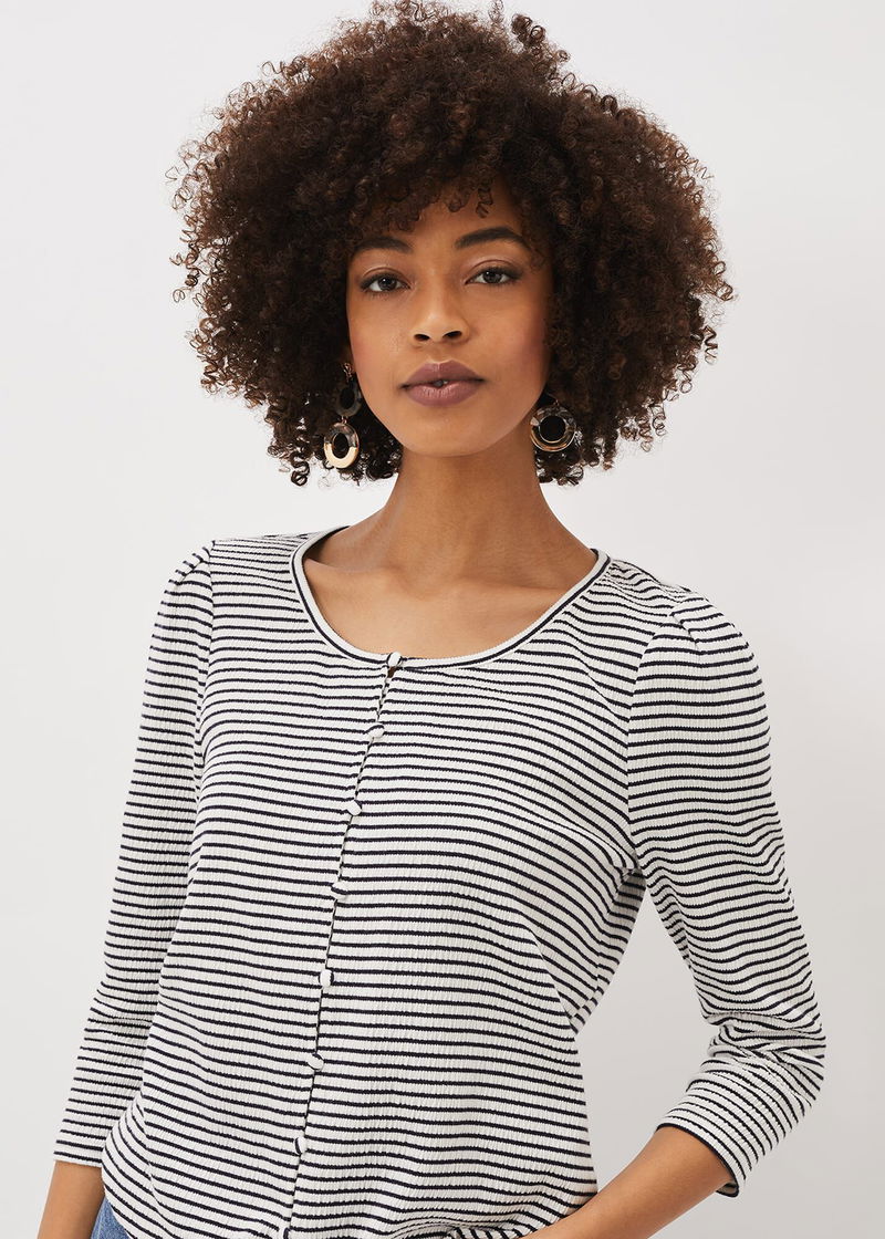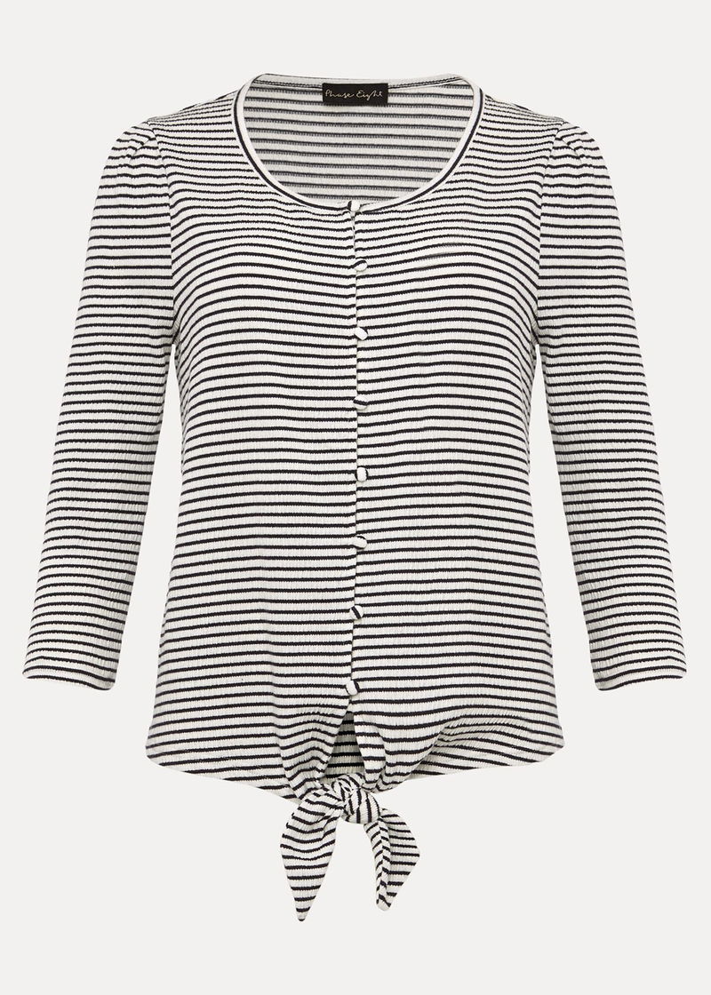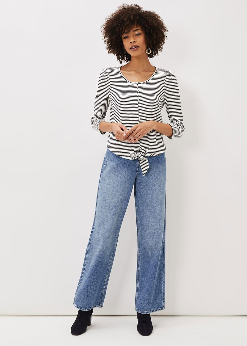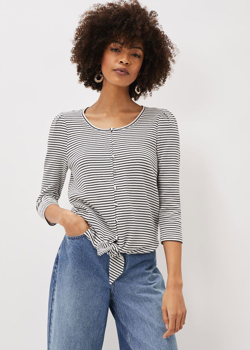 This relaxed jersey top is perfect for when the weather warms up. Designed with failsafe stripes, tie front and fabric covered button placket. We're wearing ours with jeans for an easy daytime look.
