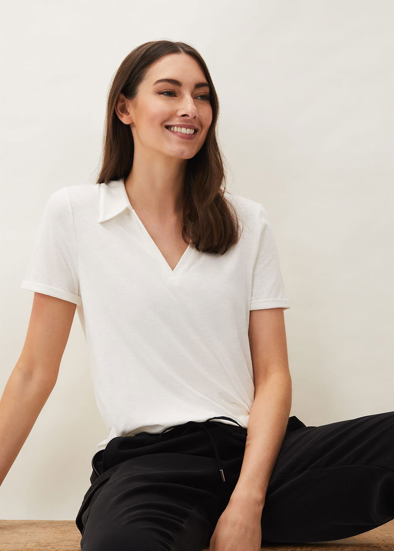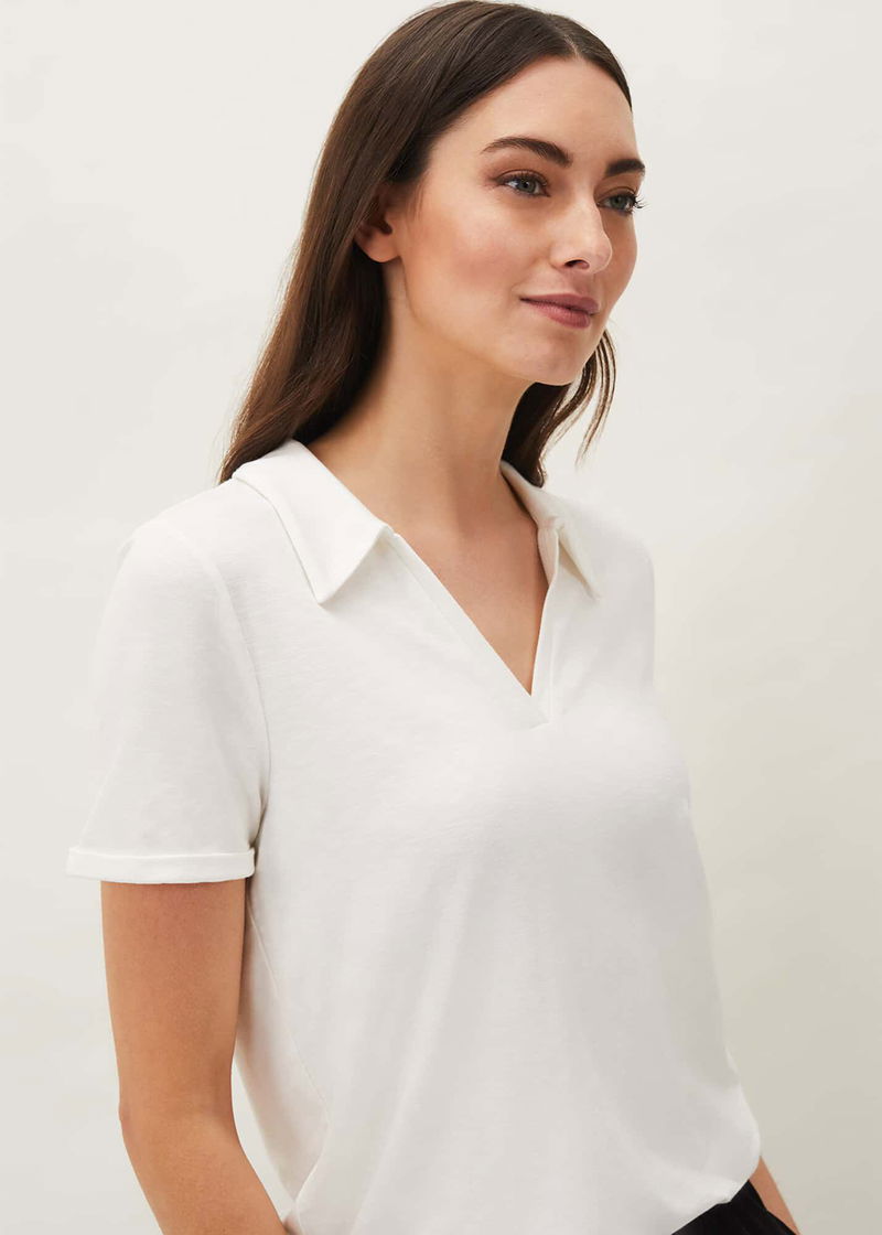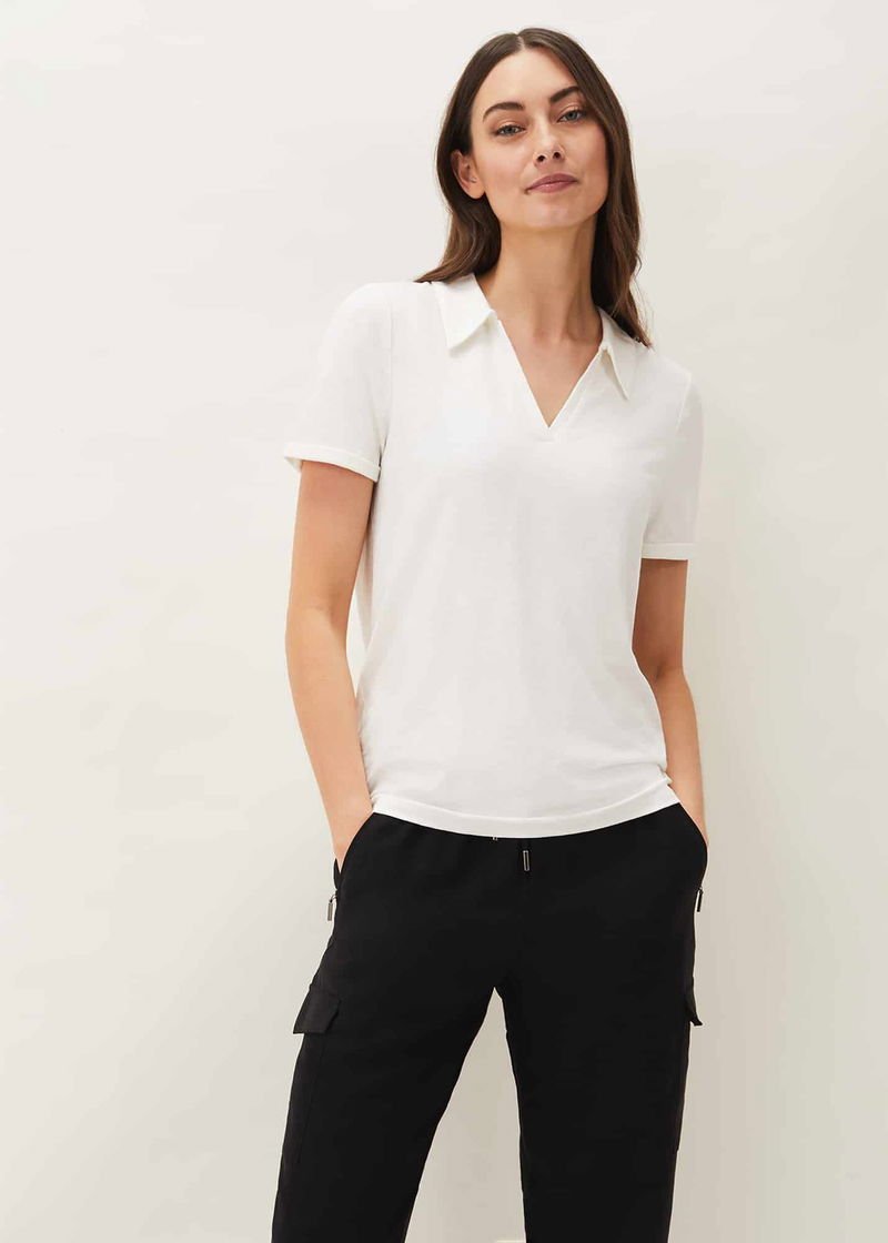 A staple for your casual wardrobe, the smart white polo neck shirt. Designed in crisp summer white, this classic style is framed by short sleeves, a V-neckline and shirt collar. Wear yours with everything from jeans to tapered joggers.