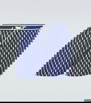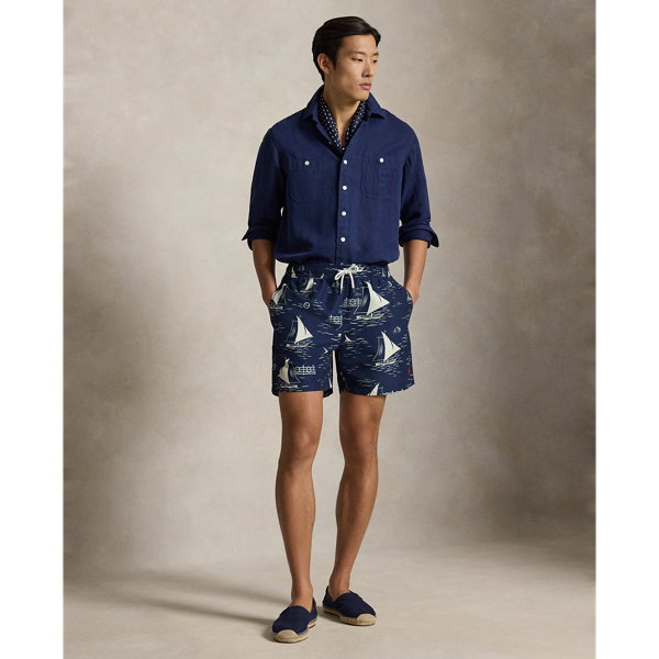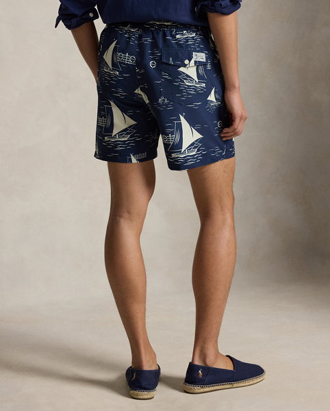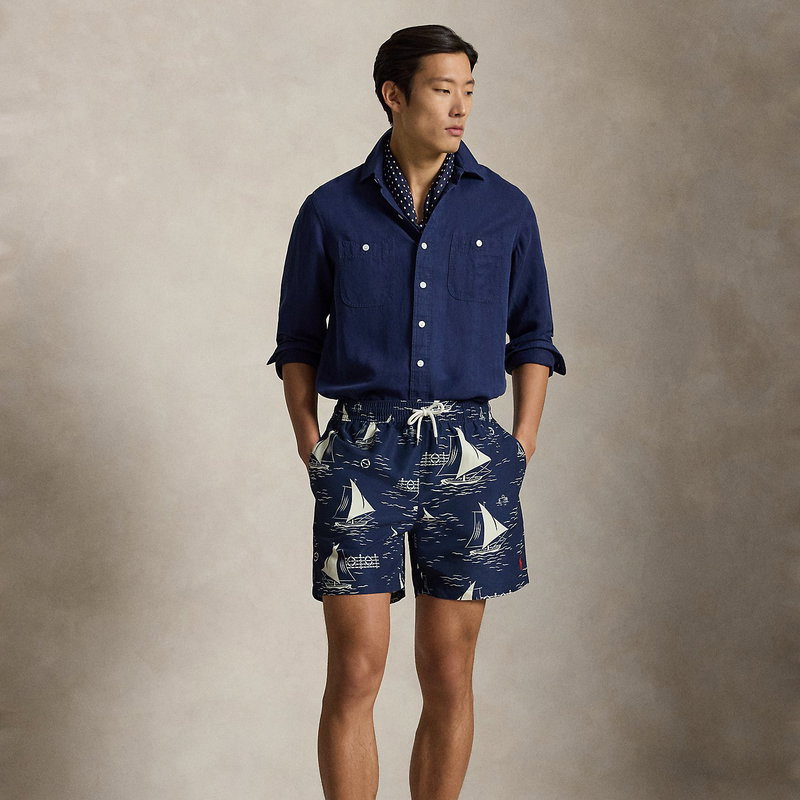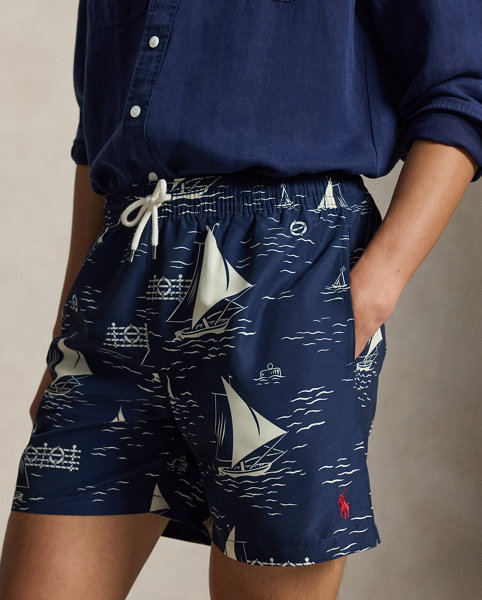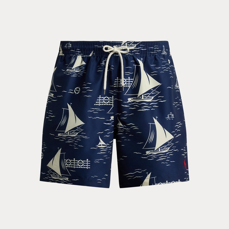 These mesh-lined swimming trunks feature a printed motif of sailboats gliding through rippling waters. The iconic embroidered Pony on the left hem gives them a signature finish.