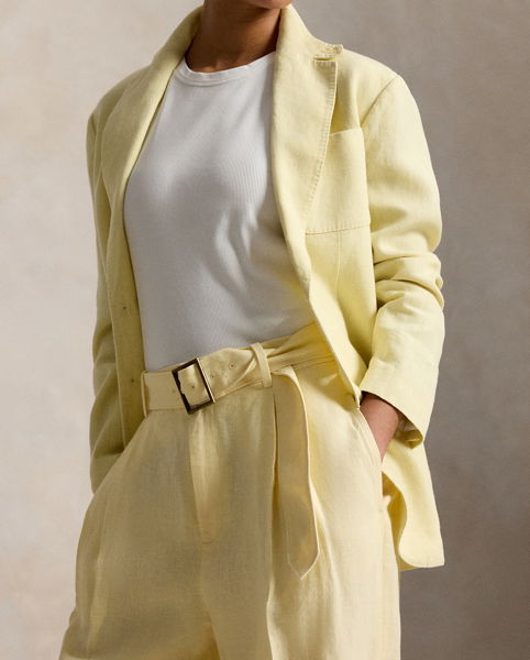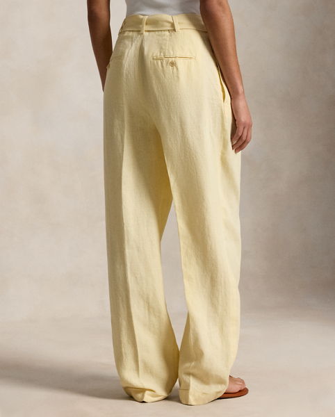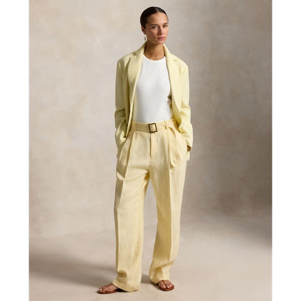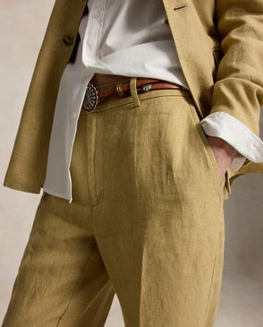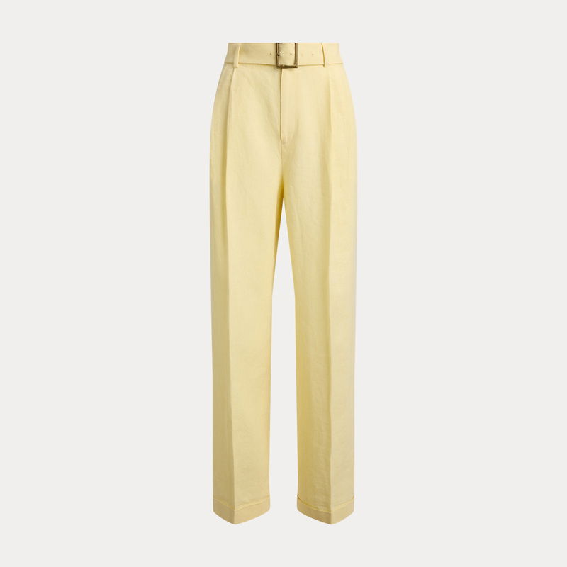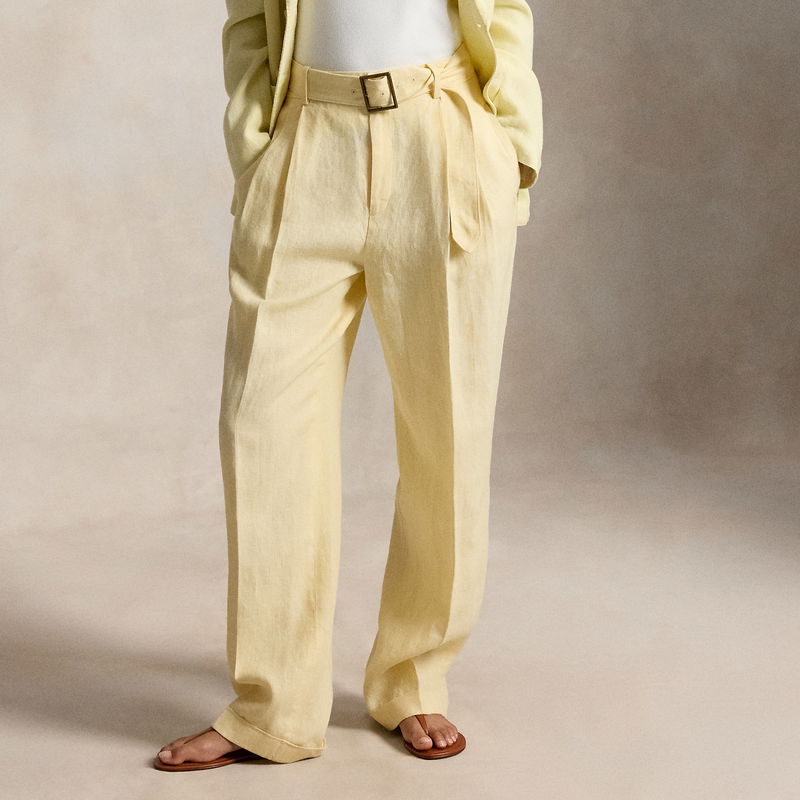 Designed for a tailored drape, these trousers are woven from linen and detailed with a buckled self-belt on the waist. Pressed creases and folded cuffs complete the look.