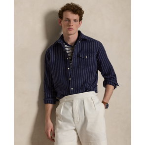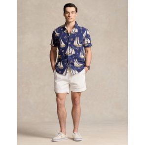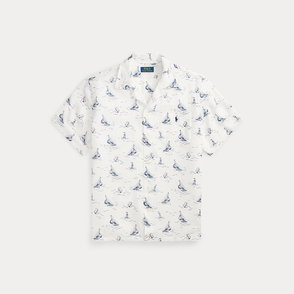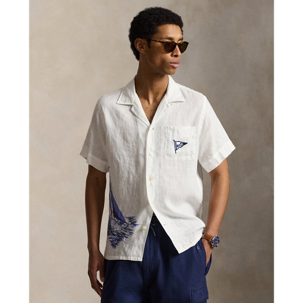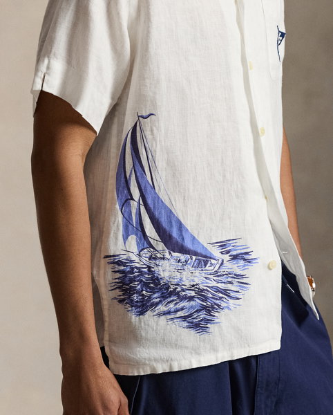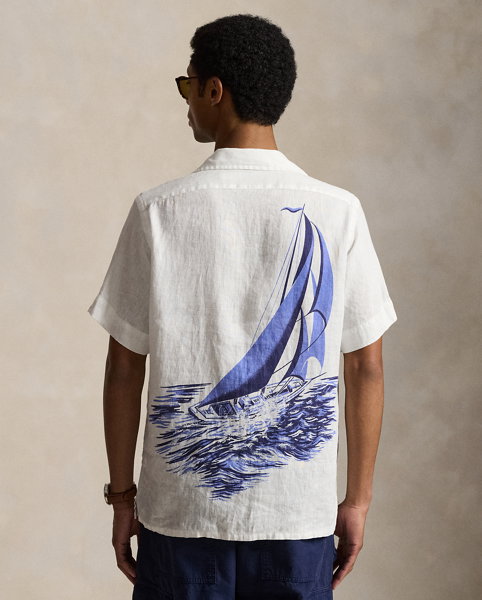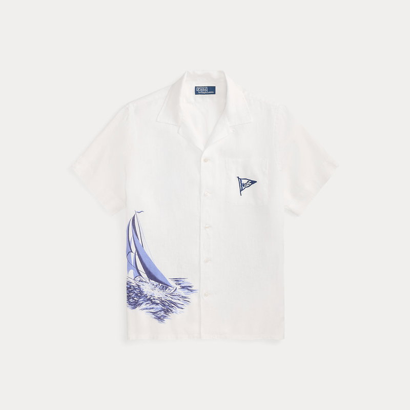 Part of the season’s collection inspired by coastal towns in New England, this linen shirt features a sailboat graphic printed on the front and back. A signature nautical flag is intricately embroidered at the chest pocket to further its marina-inspired style.