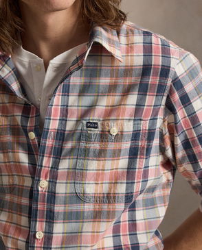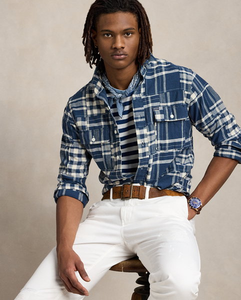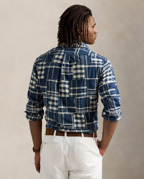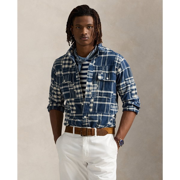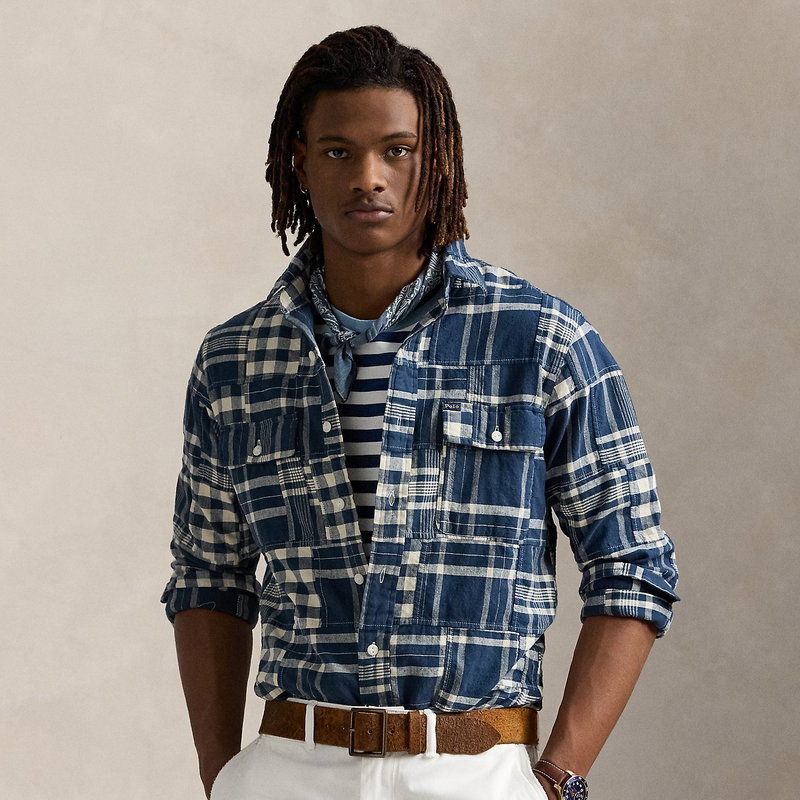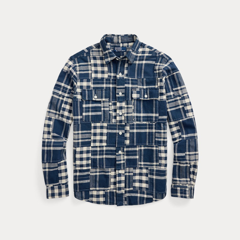 This workshirt features a patchwork design made with a mix of plaid and checked patterns. Its cotton-and-linen fabric is washed for enhanced softness.