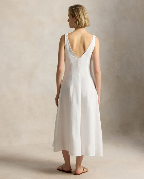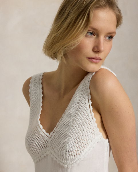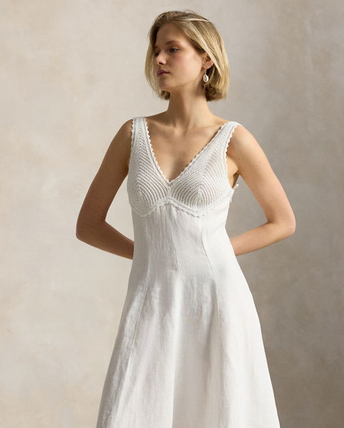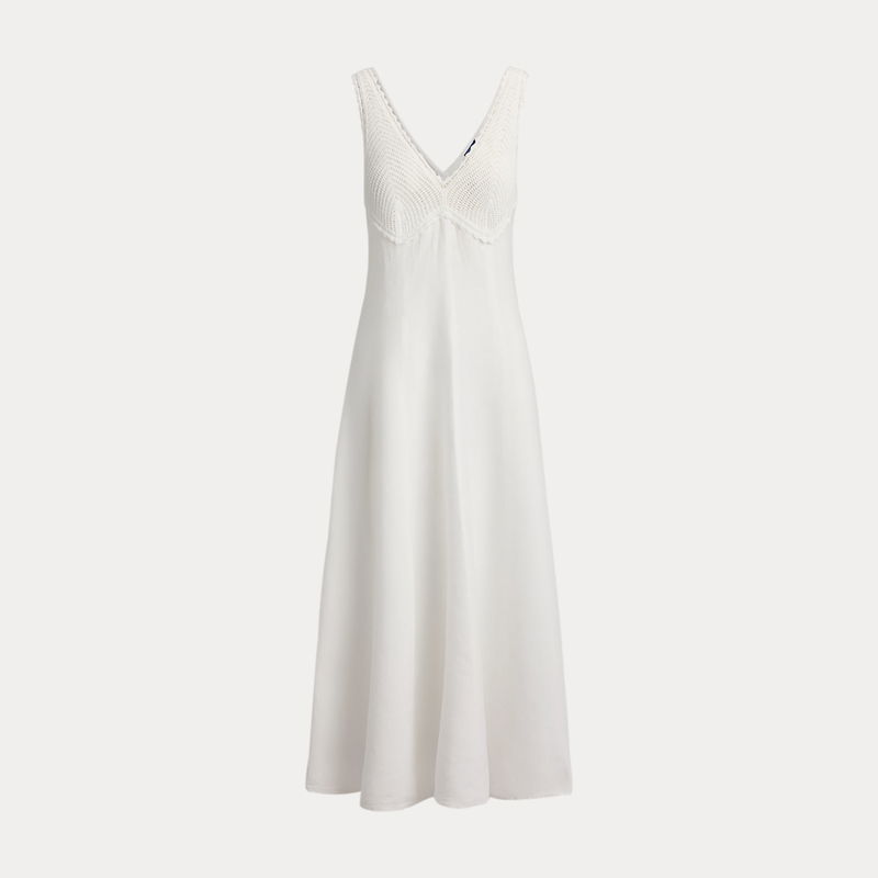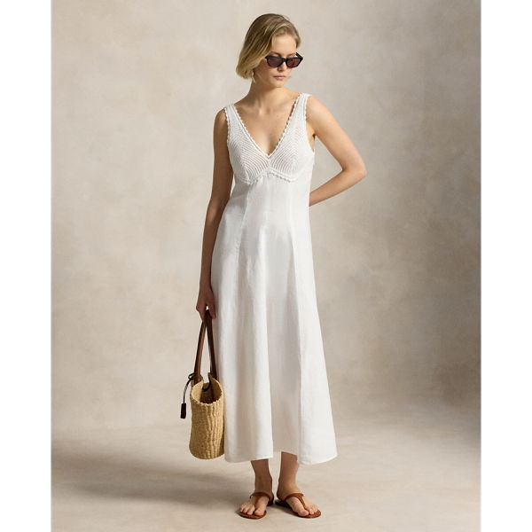 Featuring intricate crochet detailing on the bust, the panelled construction of this linen dress is designed to follow the natural shape of the body before transitioning into an elegant A-line silhouette.