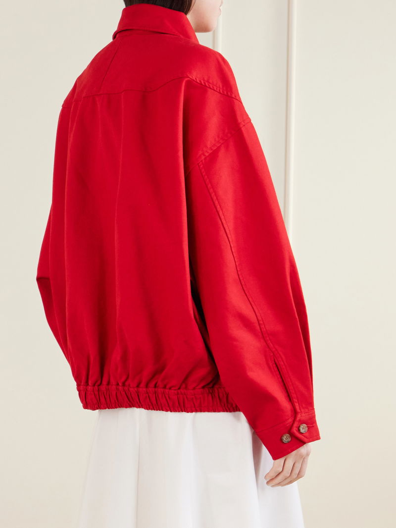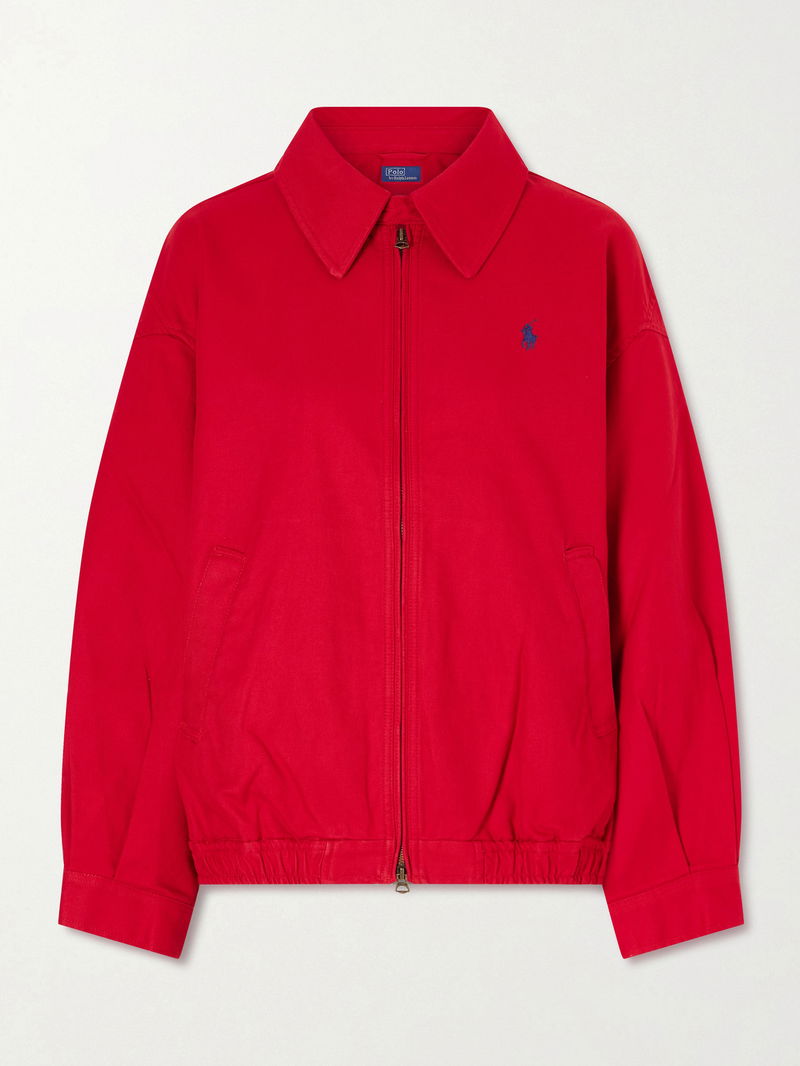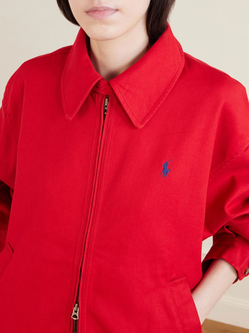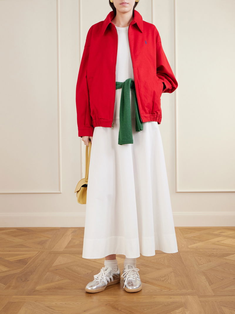 Polo Ralph Lauren’s bomber jacket reimagines a classic varsity silhouette in a confident white hue. Cut from crisp cotton for a relaxed fit, it has a stand collar and ribbed trims, balancing structure with ease. Layer it over pared-back separates to let the color and shape take focus.