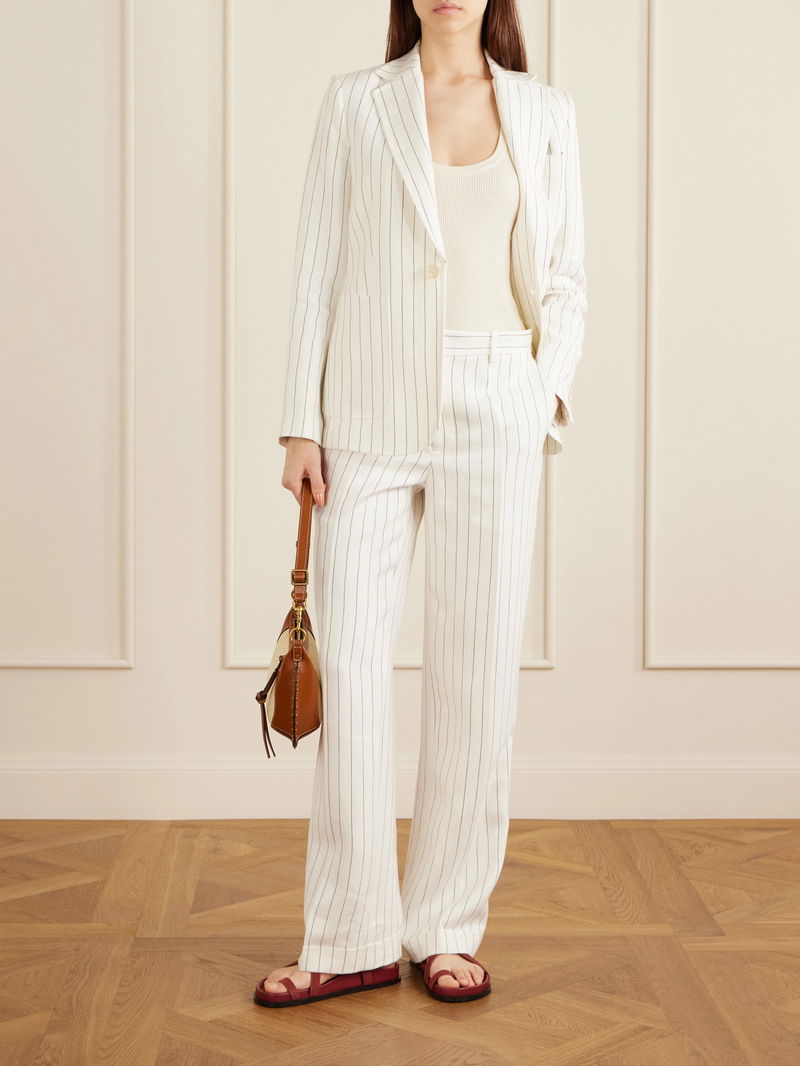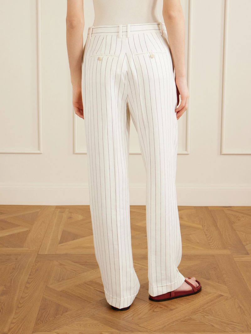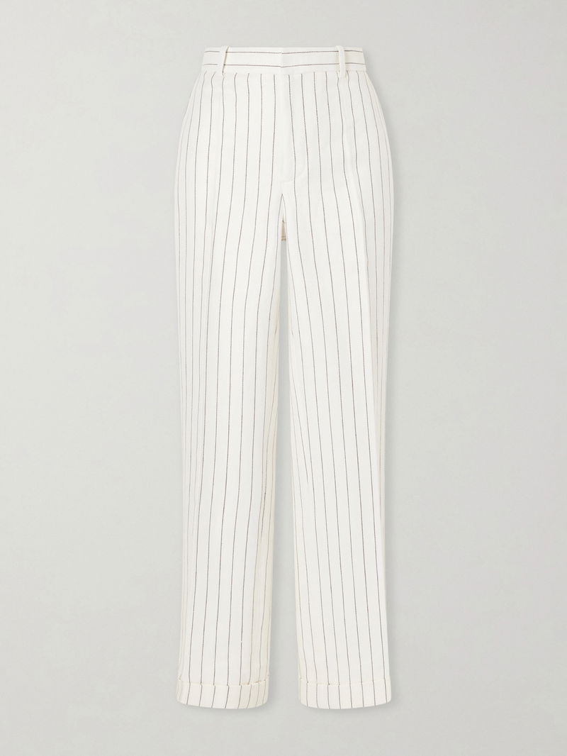 Polo Ralph Lauren blends tradition and modernity in versatile, well-crafted everyday pieces. Part of a suit, these pants are made from hemp with a pinstriped motif and feature a relaxed straight-leg fit, front and back pressed creases, and folded hems for a smart-casual look. Complete the ensemble with the matching jacket.