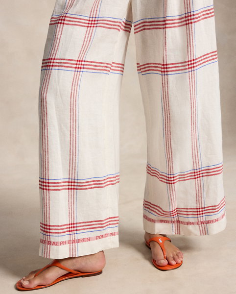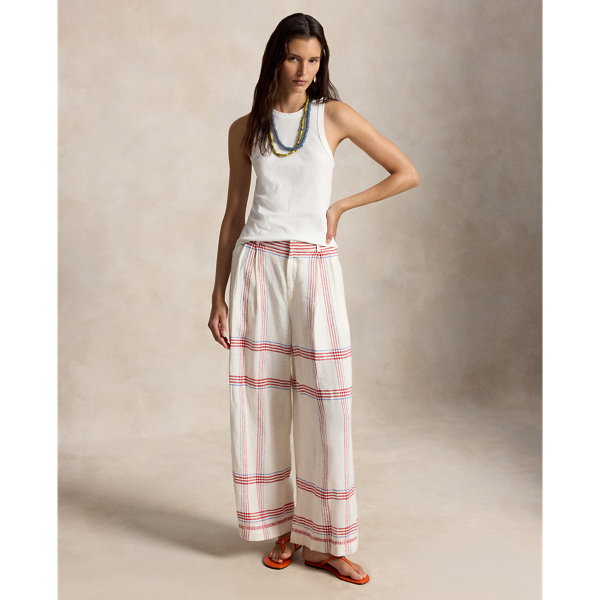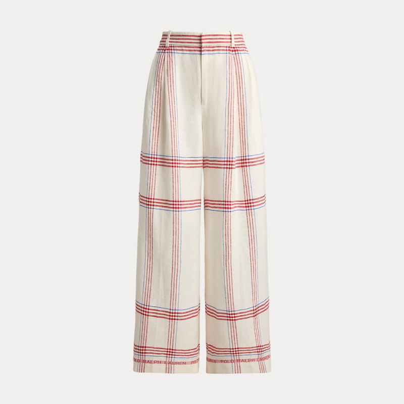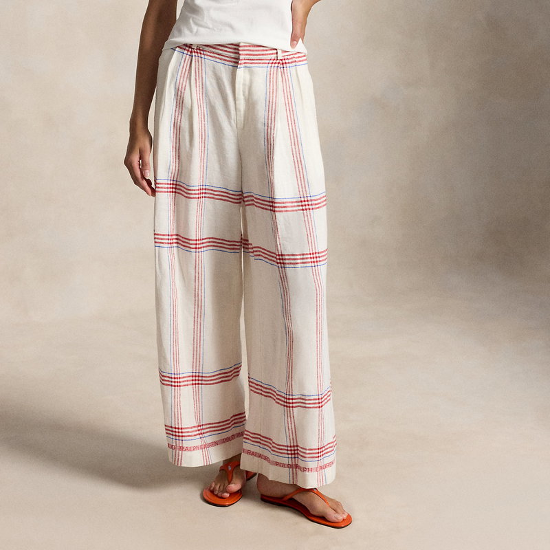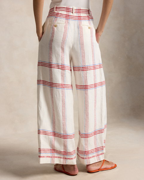 Woven linen affords a fluid drape to these yarn-dyed plaid trousers, which are tailored for a cropped, wide-leg silhouette.