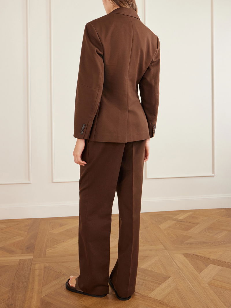 Polo Ralph Lauren’s blazer reflects the house’s commitment to creating staples that elevate everyday dressing. Tailored from a cotton and wool-blend crepe in a classic single-breasted profile, it’s lightly pinched at the waist for a structured silhouette, balanced by oversized sleeves and padded shoulders.