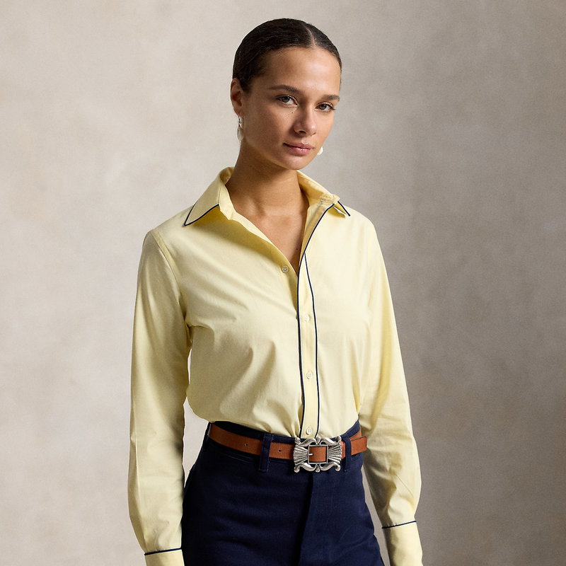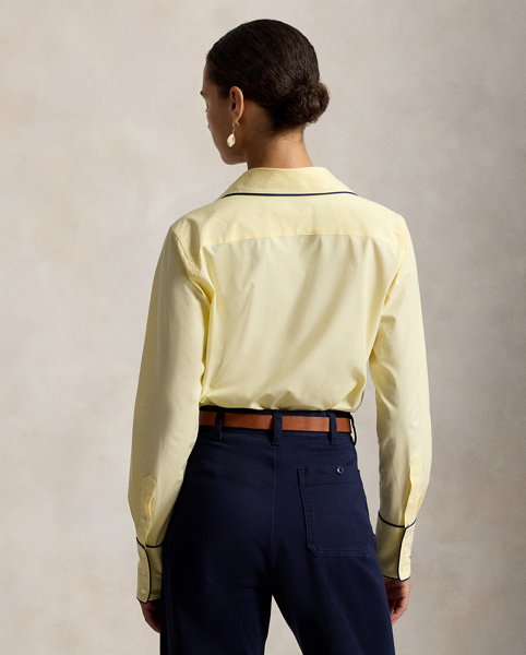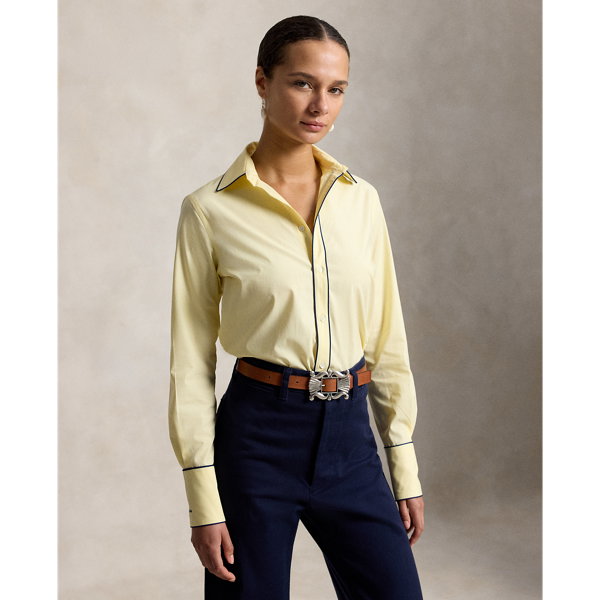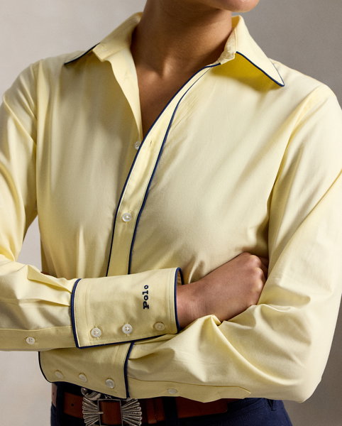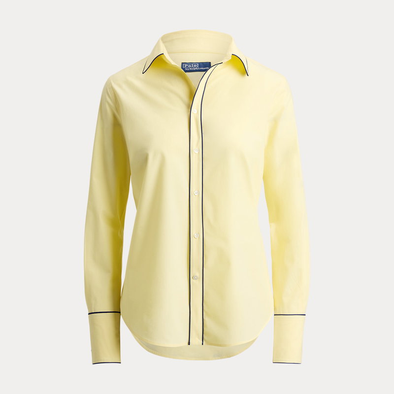This stretch cotton shirt is defined by contrast piping that traces its clean lines, bringing tailored polish to the tapered silhouette.