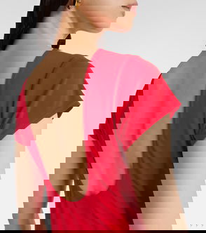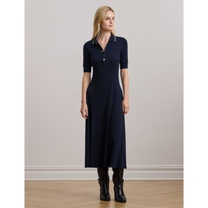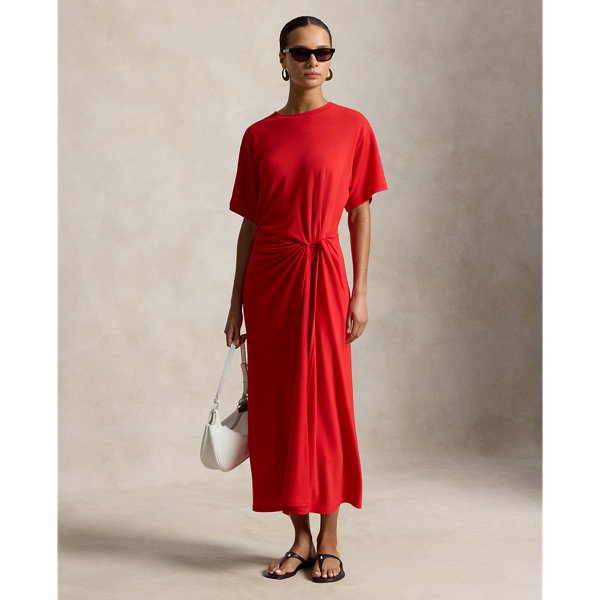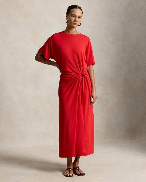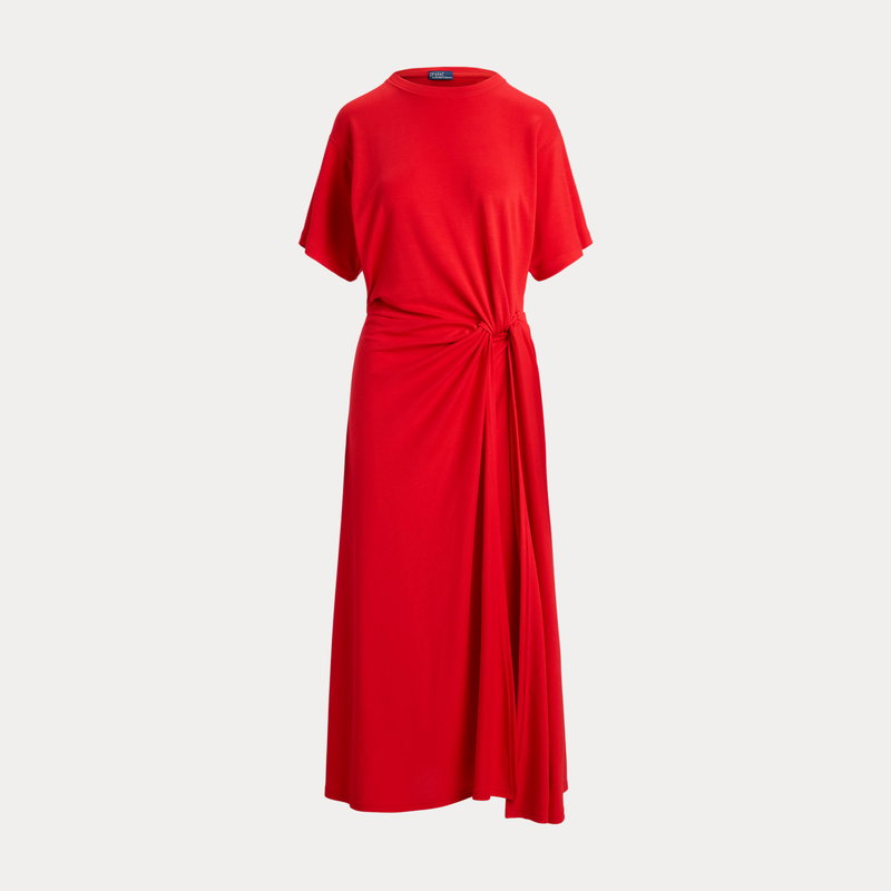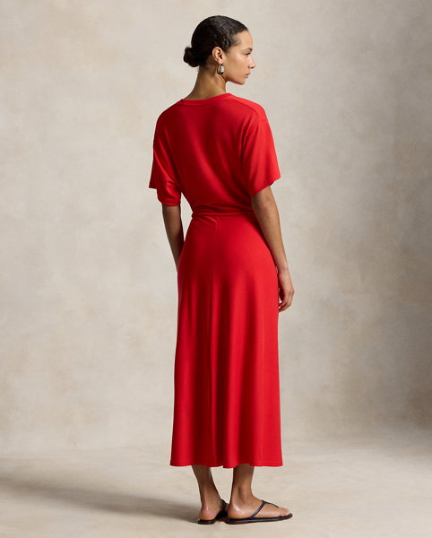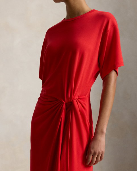 Inspired by the classic crewneck tee, this dress combines fluid stretch-blend fabric with refined construction. The relaxed bodice transitions to a fitted waist, detailed by a precise shirred twist, before falling to a softly flared shape.