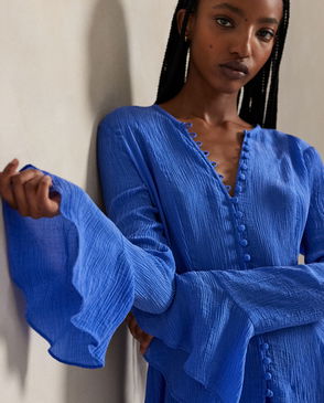 Naiomi Glasses is a seventh-generation Diné (Navajo) textile artist and designer whose work reflects the beauty of her Indigenous culture. Through the first drop in this collection, Naiomi draws inspiration from her family, homelands and community on Dinétah (Navajo Nation). Rendered in hues inspired by the traditional dock root dying process used in early weavings, this modern version of the Navajo velvet blouse features a blouson-sleeve silhouette and is detailed with silver concho buttons.