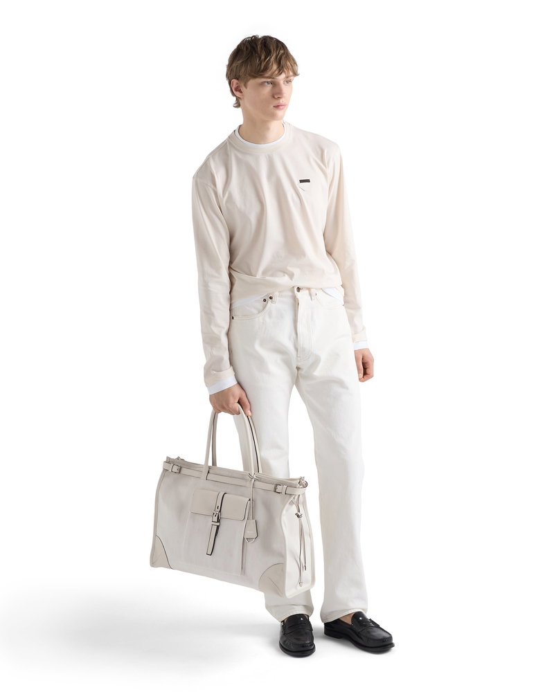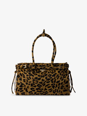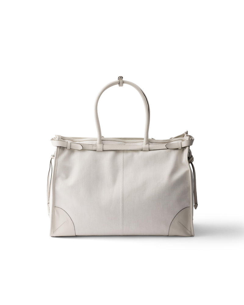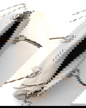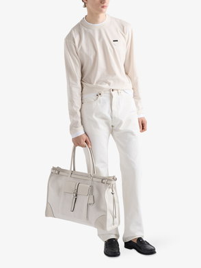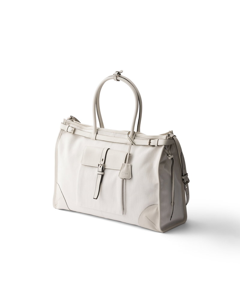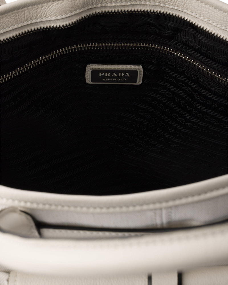 Leather handles, Detachable, adjustable leather shoulder strap. Enameled metal triangle logo on the side. Zipper closure. Removable leather key ring. One external pocket with flap, strap and buckle. Interior with zipper pocket. Logo-print.