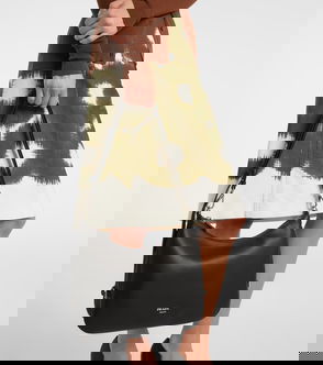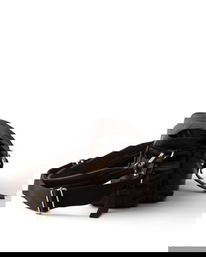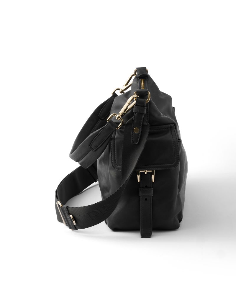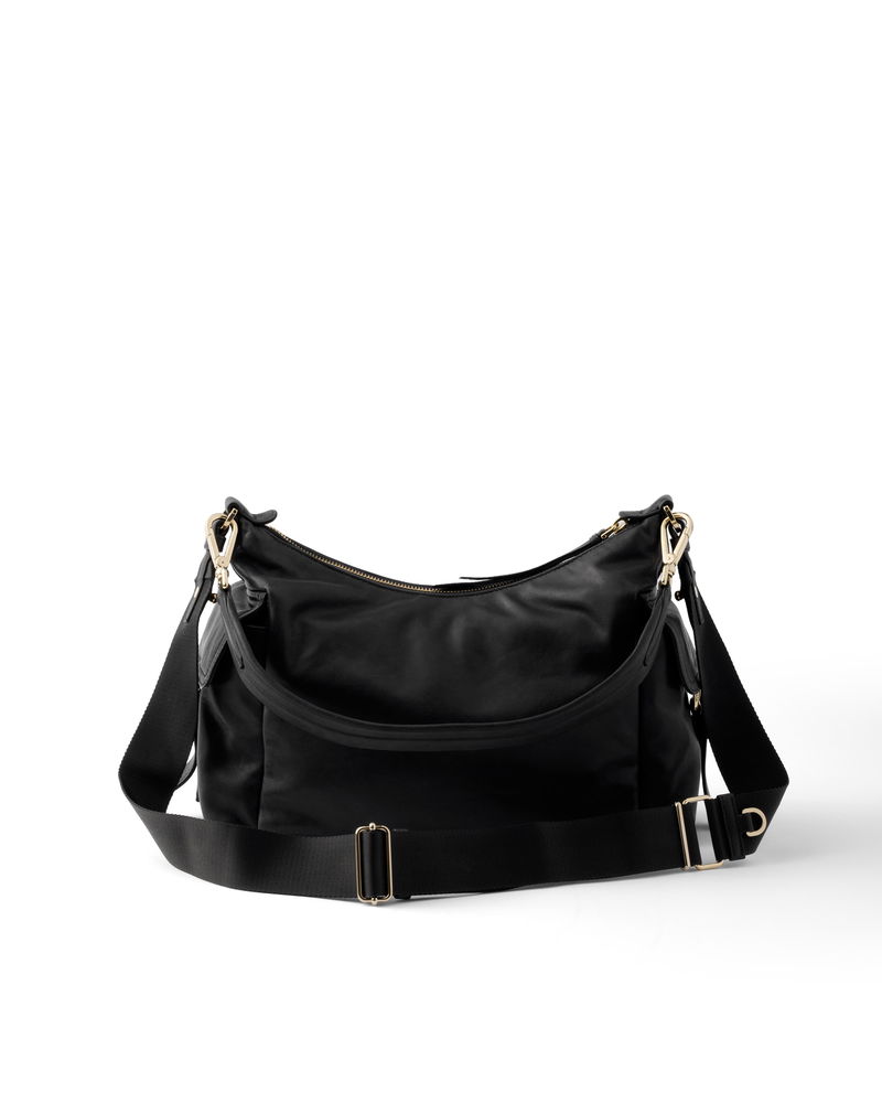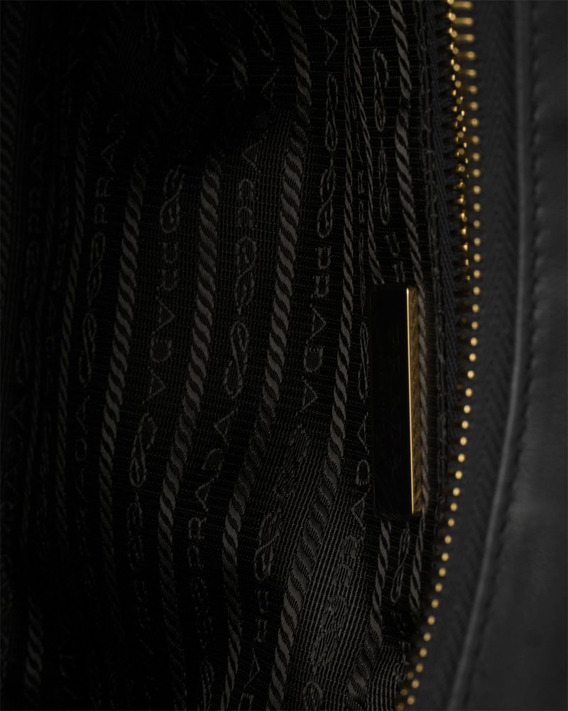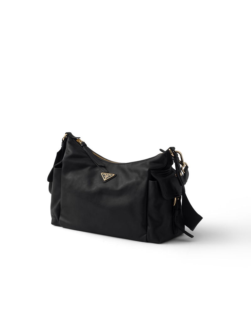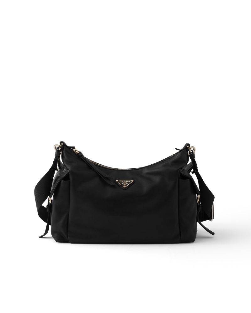 Explore large nappa leather bag. Detachable, adjustable logo-print woven tape shoulder strap.