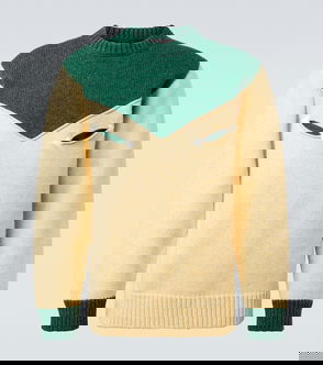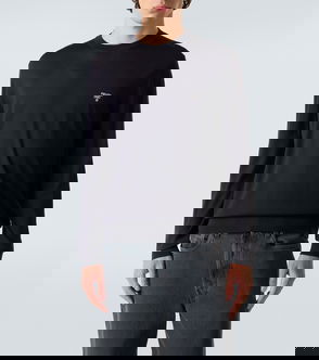 Prada wool sweatshirt. Pulls on. All-over jacquard pattern, turtleneck, tonal stitching, fitted.