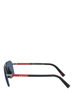 Classic metal styled sunglasses from Prada's Linea Rossa collection. Complete with square grey polarised lenses and a double-bridge, featuring Prada distinctive slotted metal element that runs from the gunmetal frame front down both temples. Finished with Prada branding.