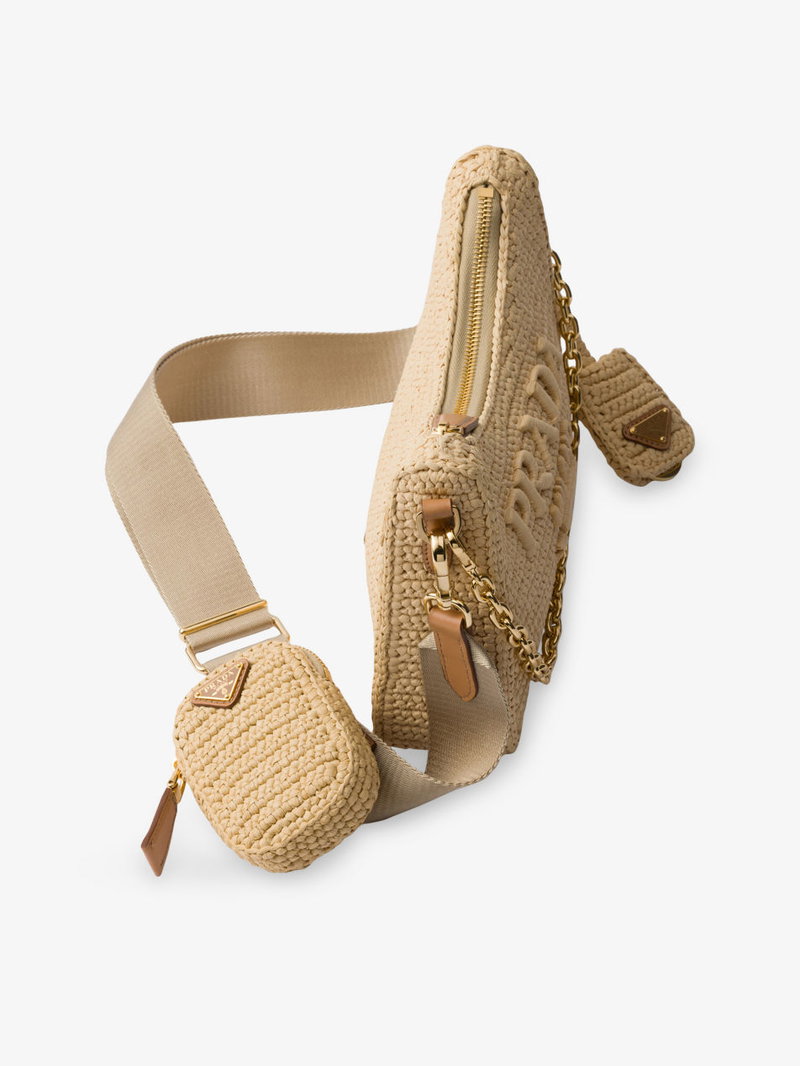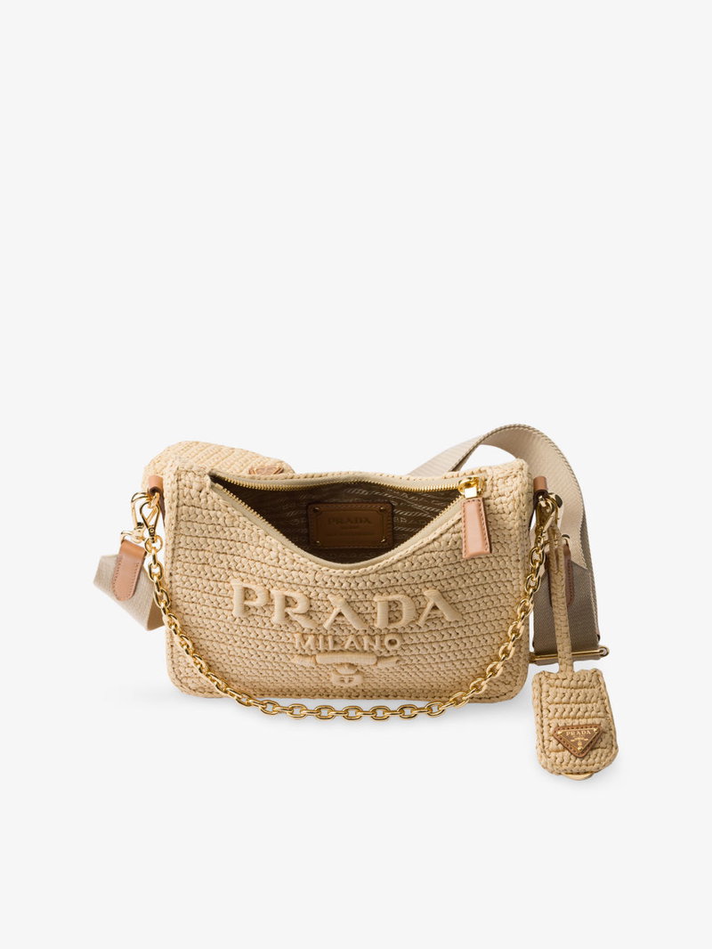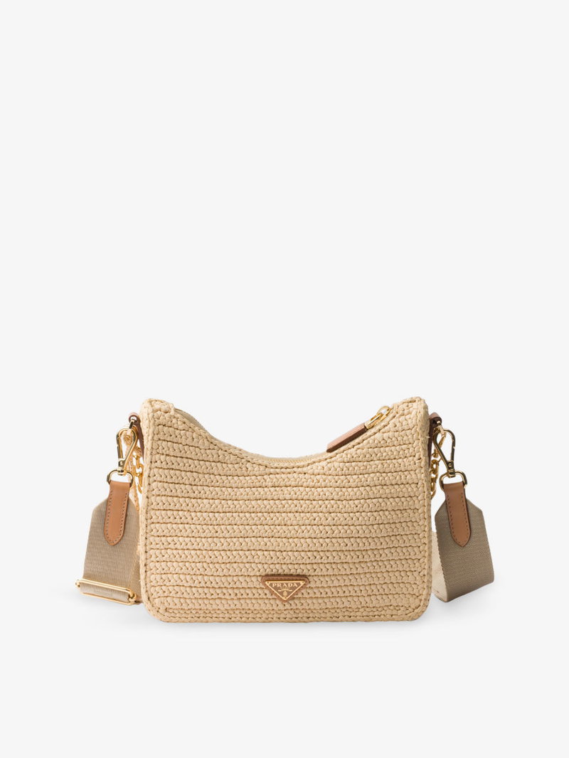 • Soft shape, removable chain strap, adjustable shoulder strap, embroidered logo at front, enamelled metal logo at back, one main compartment, raffia-effect yarn