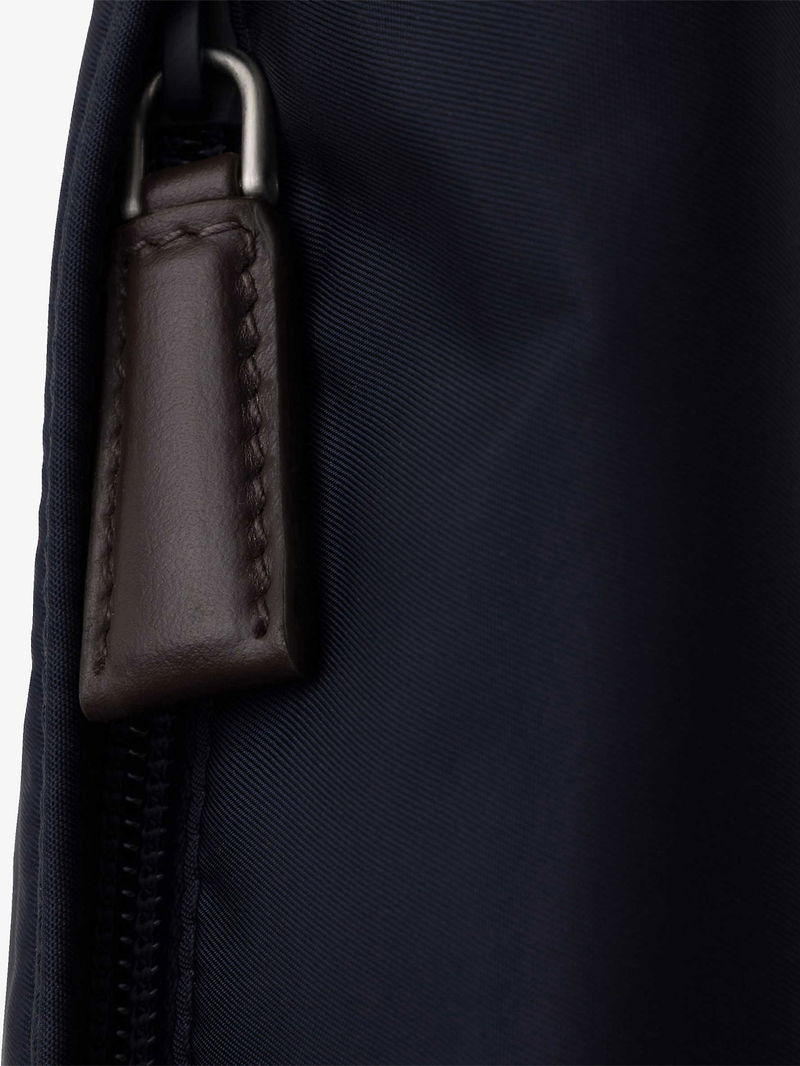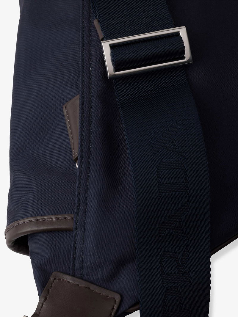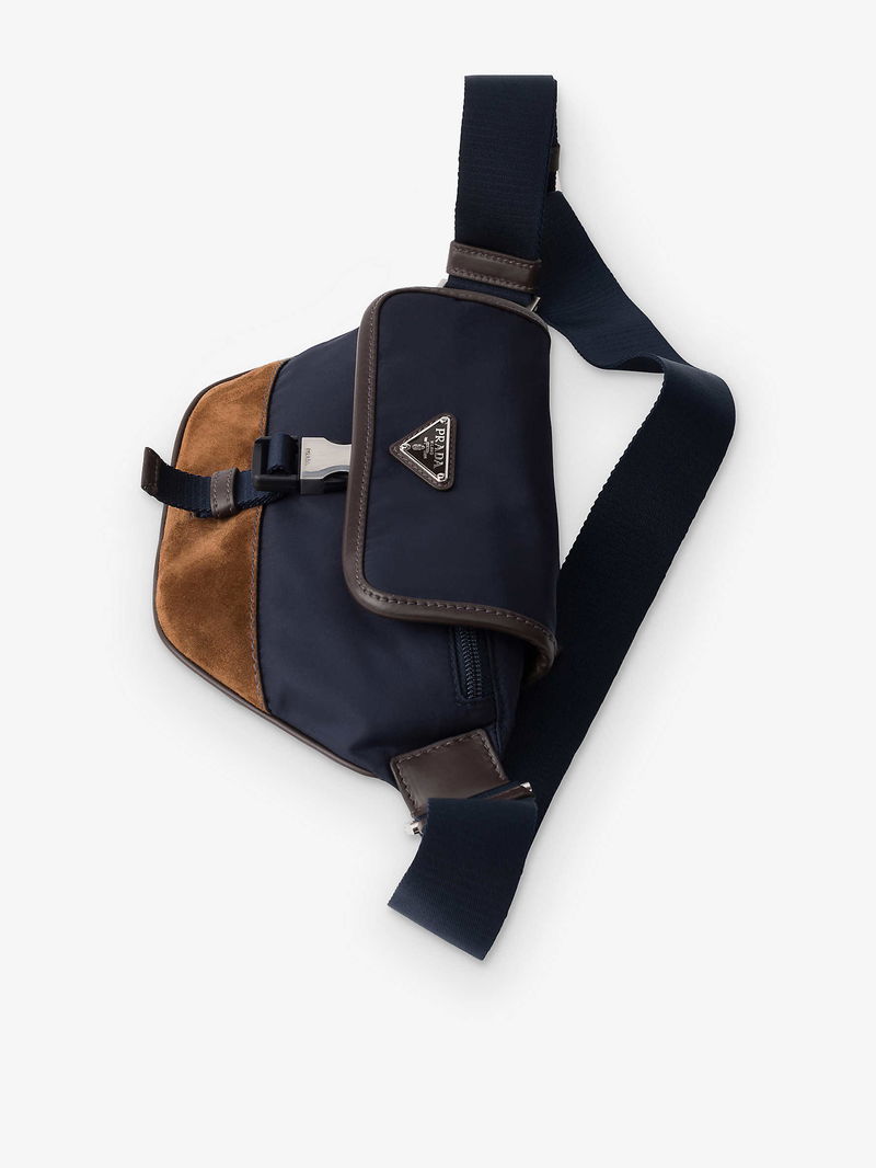 Prada Re Nylon and leather cross-body bag. Adjustable strap, front enamelled triangle logo at front, external zip pouches, internal slip pocket, suede trims.