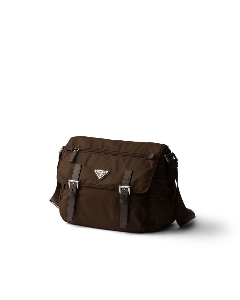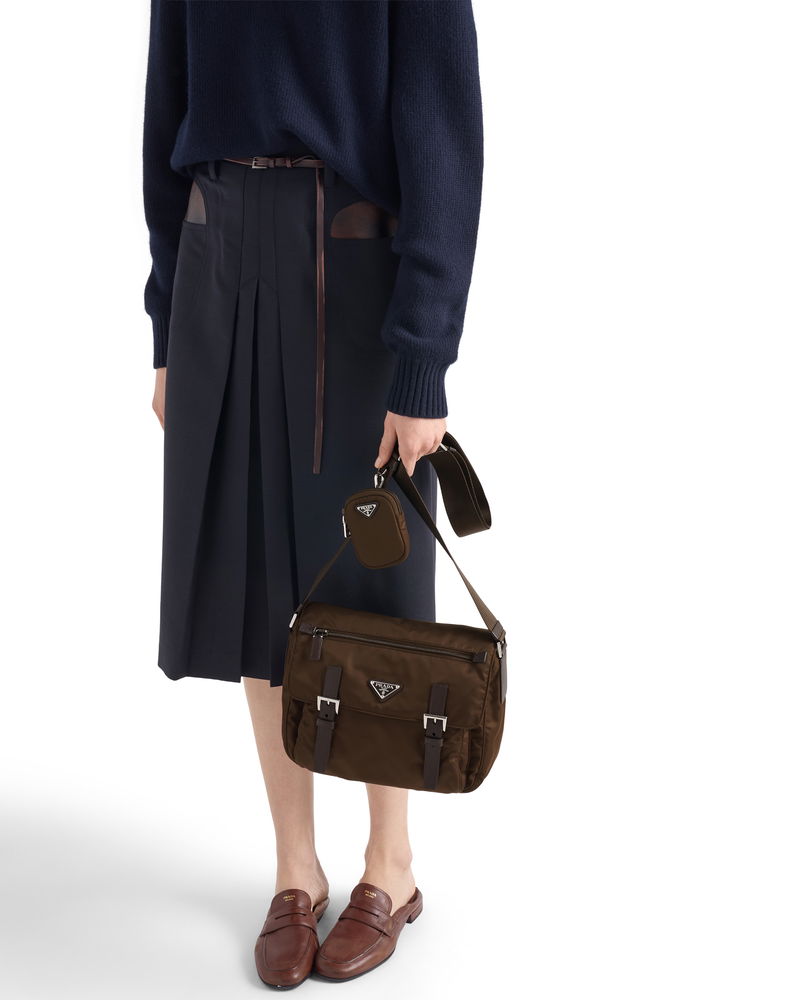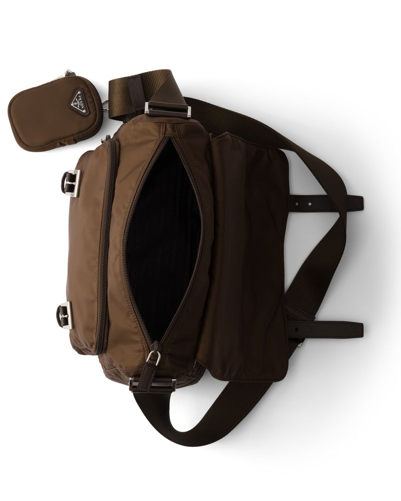 Re-nylon shoulder bag. Adjustable 95 cm woven tape shoulder strap. Removable Re-Nylon pouch with zipper closure.
