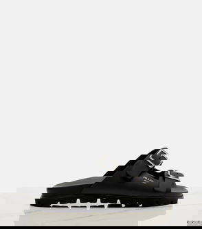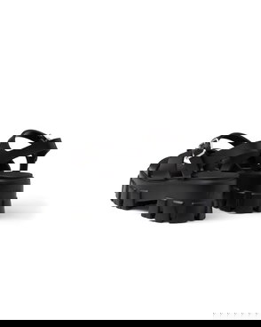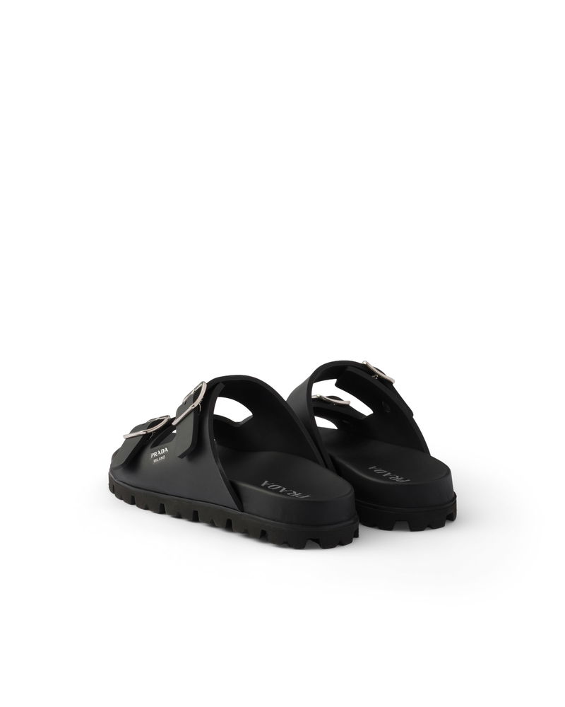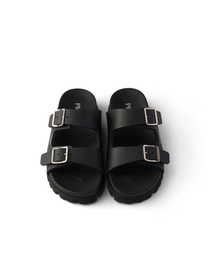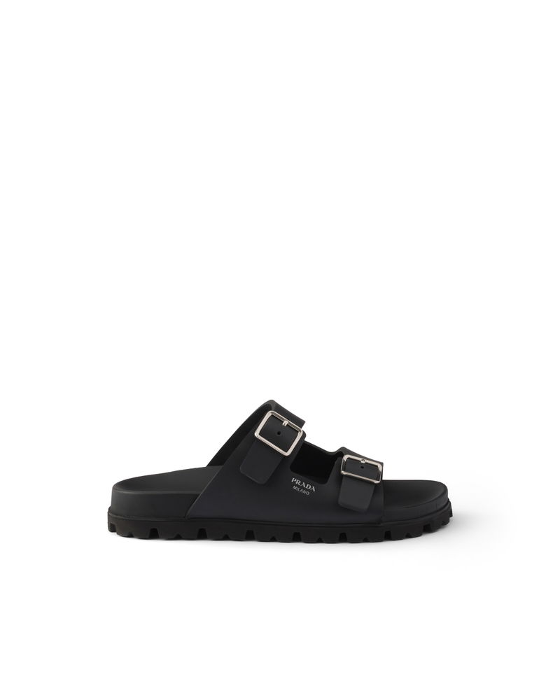 Rubber slides. Upper with straps and metal buckles. Screen-printed logo.