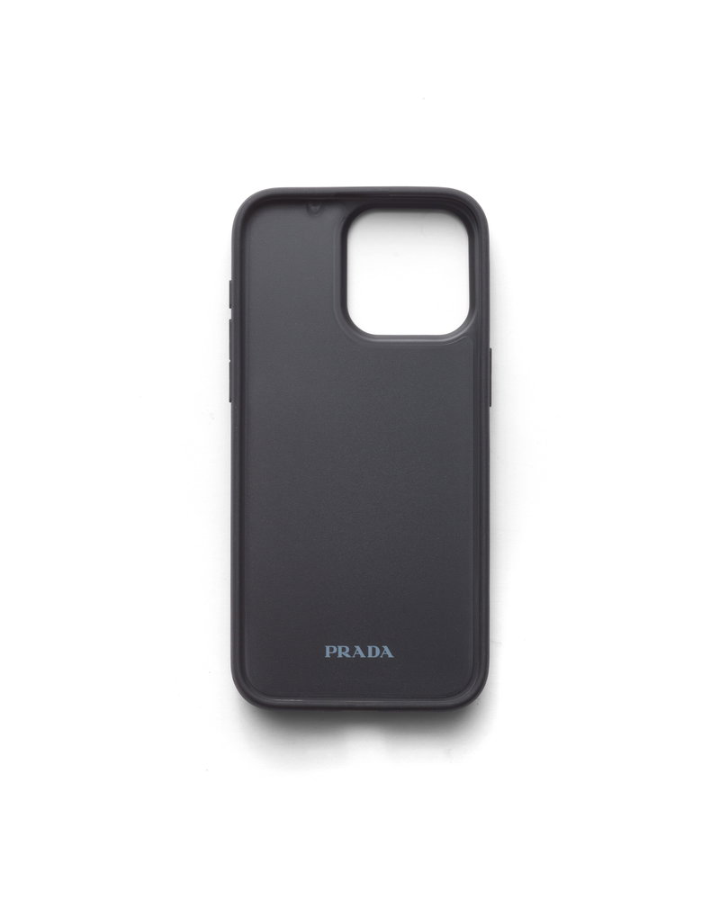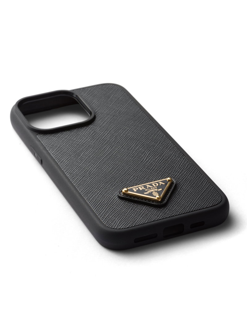Saffiano leather cover for iphone 15 pro max. Enameled metal triangle logo.