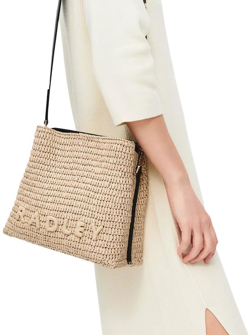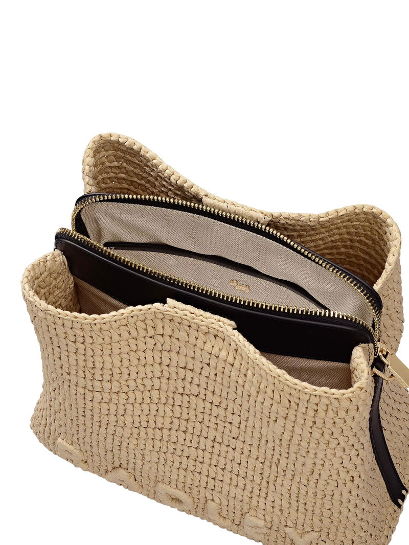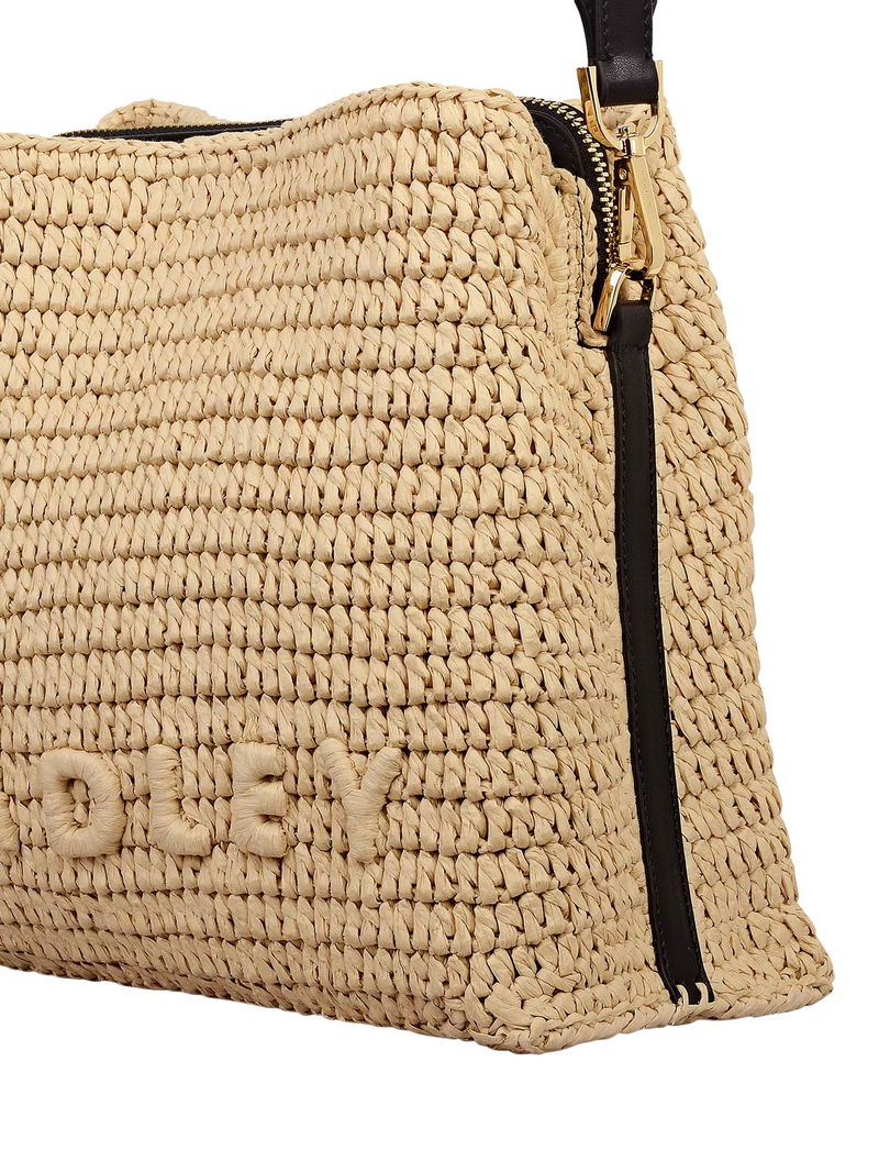 From the iconic Dukes Place family, the bestselling boxy cross body bag is now crafted in natural woven raffia with contrast smooth leather trims.