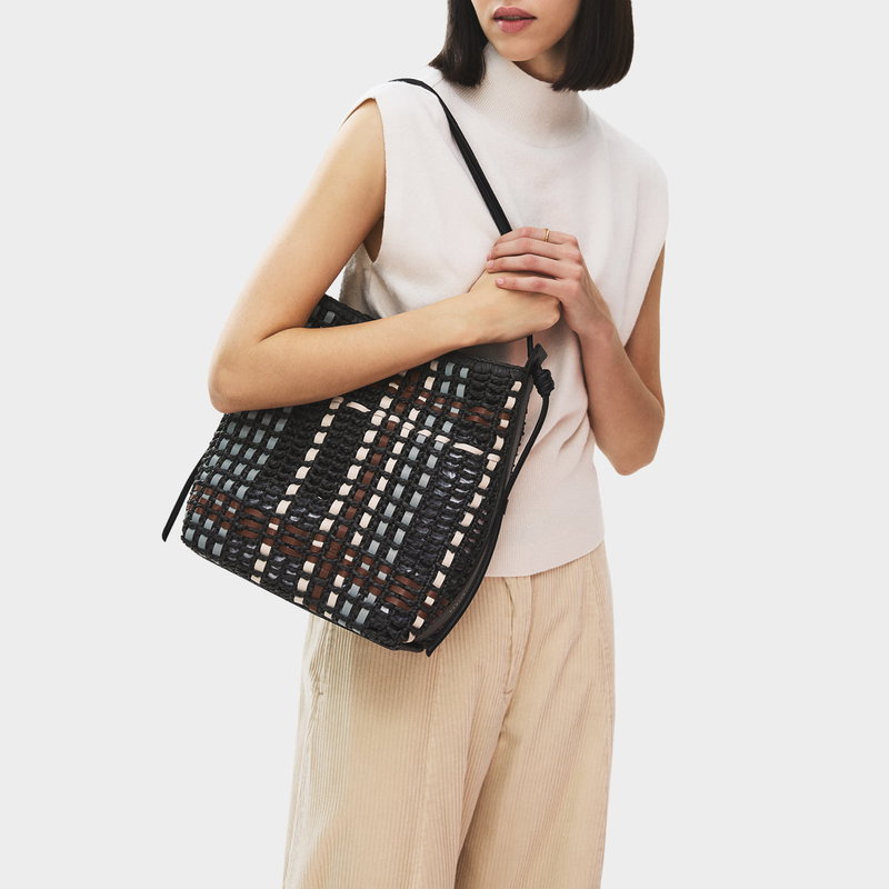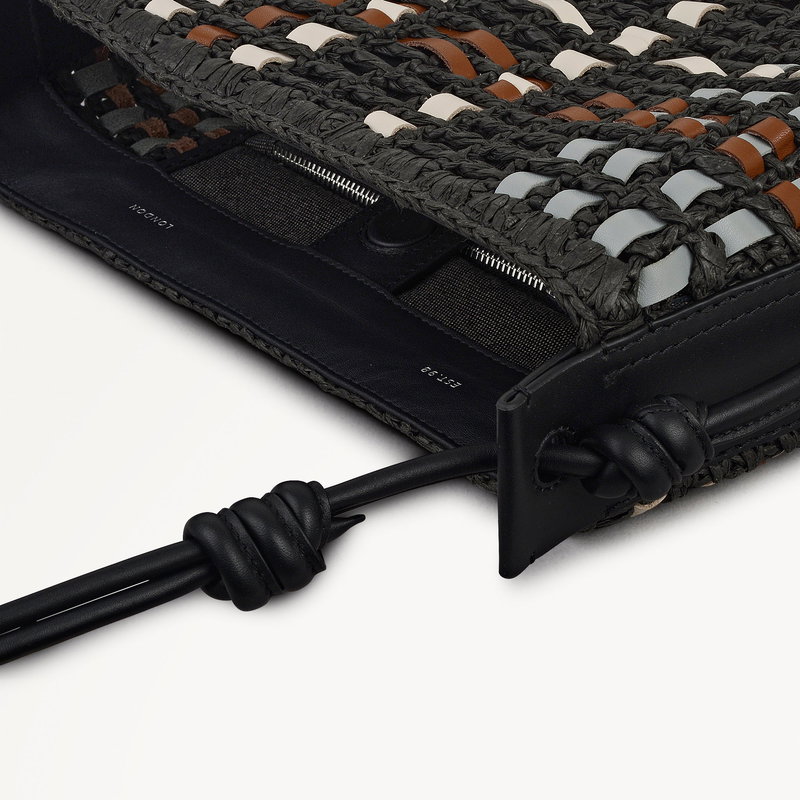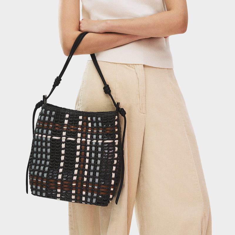 Craft details transform The Camden from an everyday beach-style bucket bag into an artisanal creation. This Raffia Check edition is made with strips of contrasting smooth leather threaded throughout the open raffia weave, creating a checked pattern.