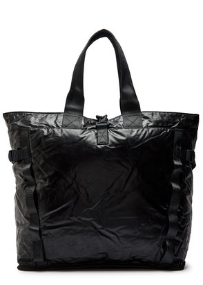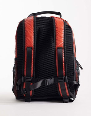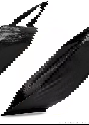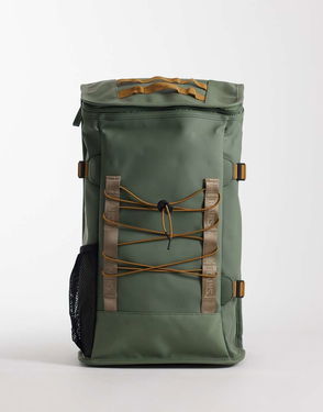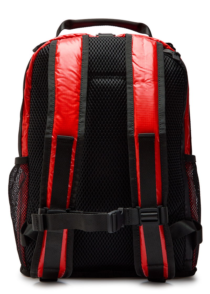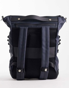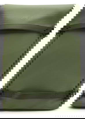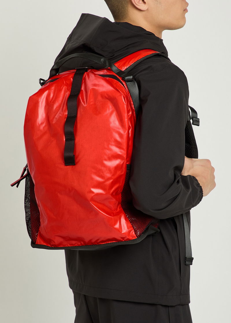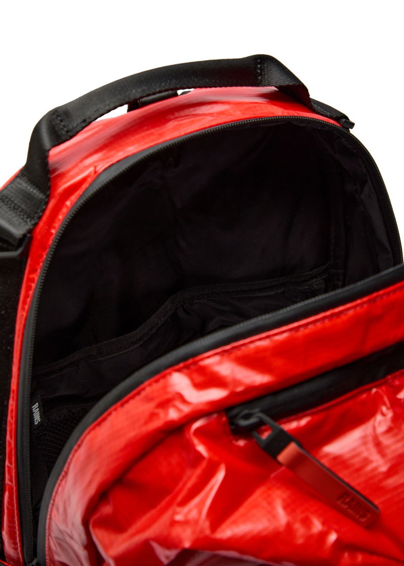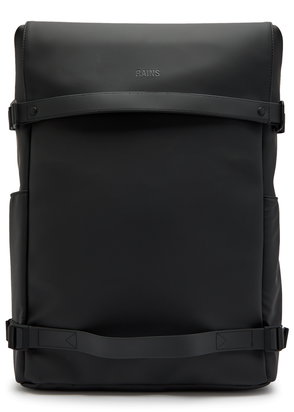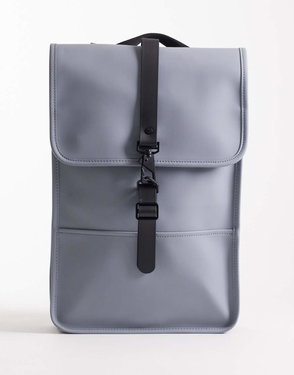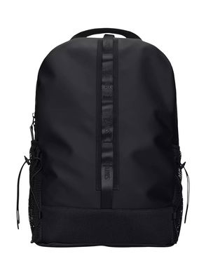 Rains waterproof backpack. Webbing top handle, two adjustable quilted shoulder straps with buckle-fastening connect, zip-fastening front slip pocket, hook-fastening webbing trim with logo jacquard, side mesh patch pockets, quilted mesh back, internal laptop slip pocket, internal mesh patch pocket, internal zip-fastening pocket fully lined.
