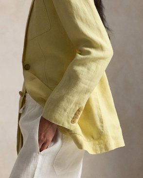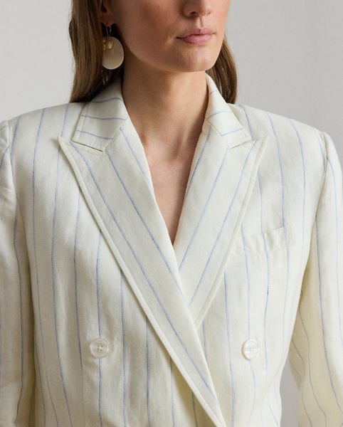 Slender yarn-dyed stripes punctuate the streamlined silhouette of this double-breasted blazer, which is tailored with lightweight linen twill.