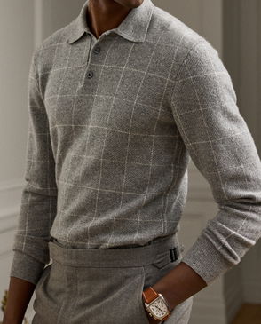 Uniting multiple fine-gauge cashmere yarns and a jacquard-knit technique, this Italian-crafted jumper is an exemplary take on tone and texture. The lightweight layer reimagines Ralph Lauren Lauren's iconic Polo shirt silhouette and features considered details such as genuine mother-of-pearl buttons. Its tonal plaid pattern draws inspiration from a woven fabric that is used in the Purple Label collection.