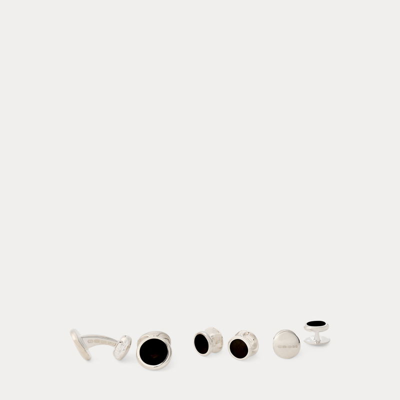 Finely crafted and hand-finished in the United Kingdom with polished sterling silver and genuine onyx, this set includes a pair of cufflinks and matching shirt studs.
