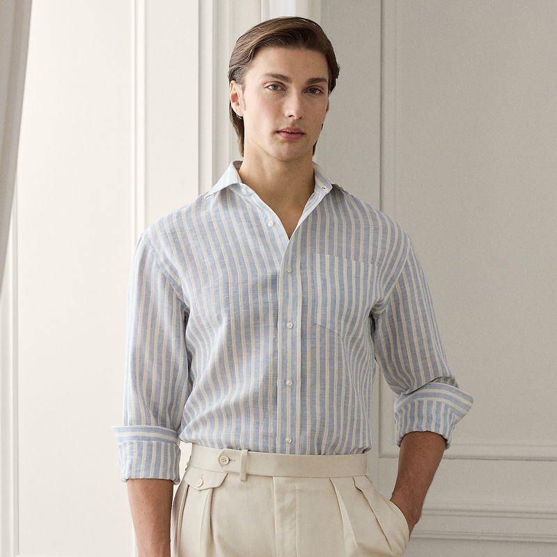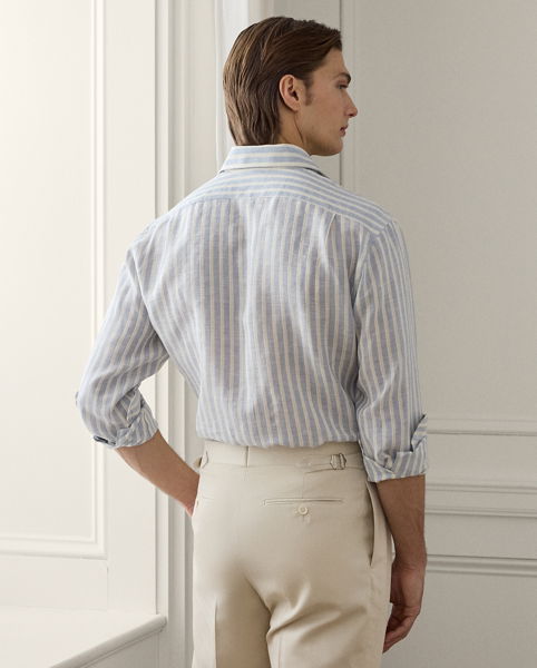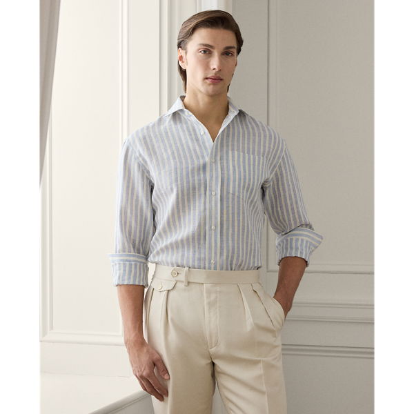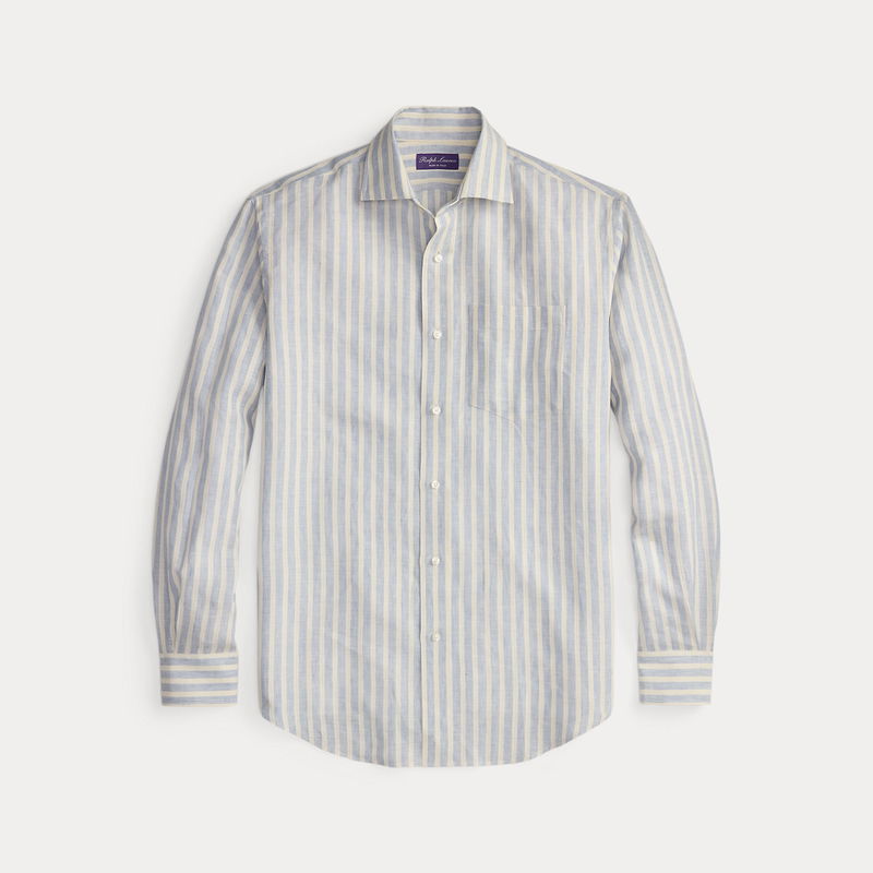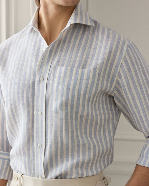 This Italian-crafted shirt exemplifies Purple Label’s pursuit of textile innovation through its striped dobby fabric, which is beautifully woven with linen and cotton.