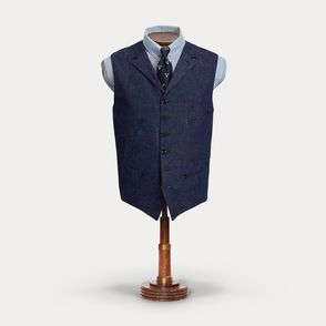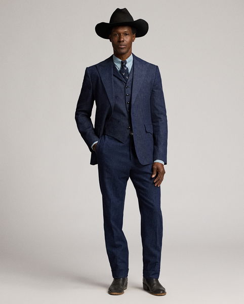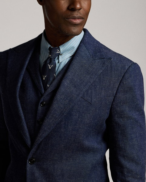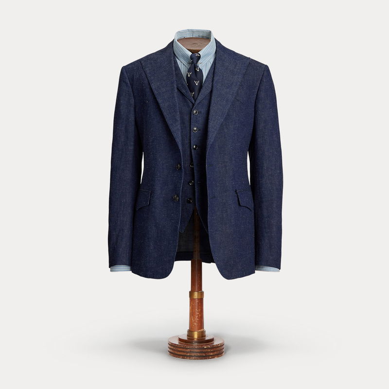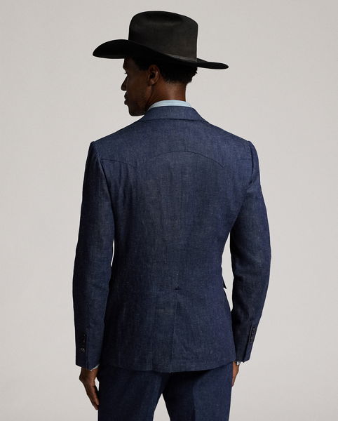 Peak-lapel suit jacket tailored in Italy. The indigo-dyed denim was custom-woven in Japan using cotton and linen. Western-style yokes and pockets. Triangular reinforcements. Half-lined. Genuine horn buttons.