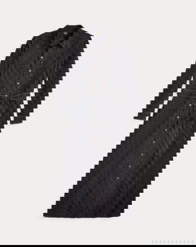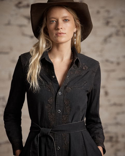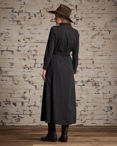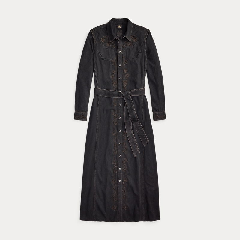 Western-style shirtdress made from lightweight Japanese denim. Vintage black wash. Chain-stitched tonal floral embroidery throughout. Western-style yokes and pockets. Unlined. Comes with a self-tie belt. Diamond-shaped snaps. Metal button on the collar.