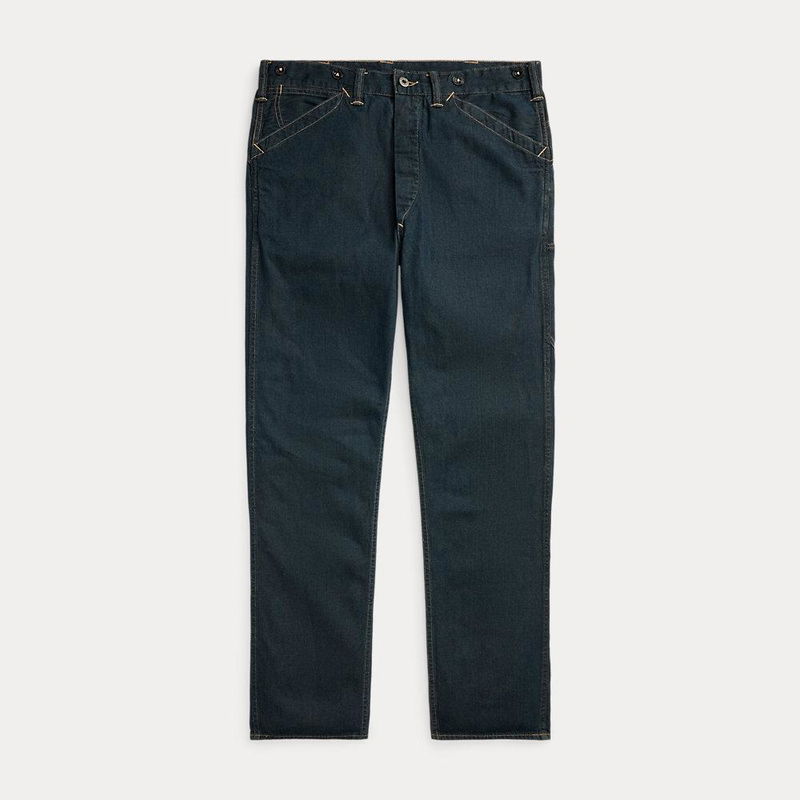 Straight-fitting trousers made with Japanese denim. Cotton-blend yarns are spun with linen and ramie. Dark indigo wash with a green cast. Details inspired by 1920s workwear. Button fly. Adjustable buckled back is reinforced at the waistband and side seams. Rinsed. Sanforized to minimise shrinkage.