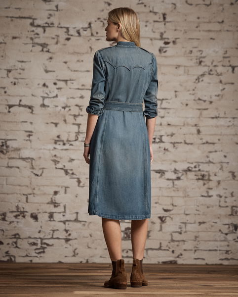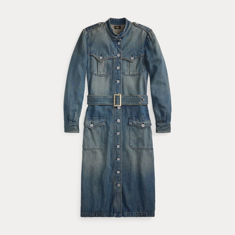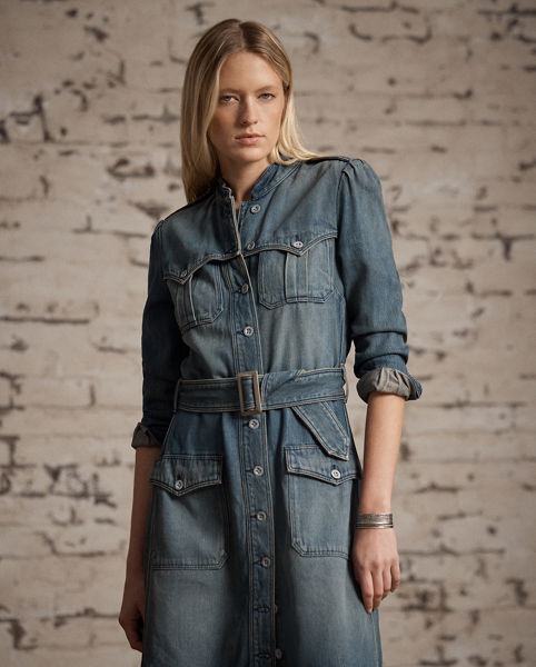 Lightweight denim dress can be worn buttoned or open as a duster. Right-hand twill is yarn-dyed with true indigo and washed. Vintage surplus-inspired detailing. Capelet-style yokes. Comes with a buckled self-belt. Metal buttons.