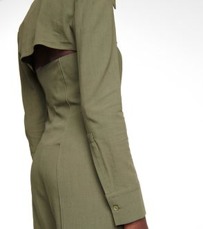 Short-sleeve jumpsuit made with cotton-blend jacquard fabric. Yarn-dyed with true indigo. Details inspired by a Victorian sporting style. Spread sailor collar. Rinsed.