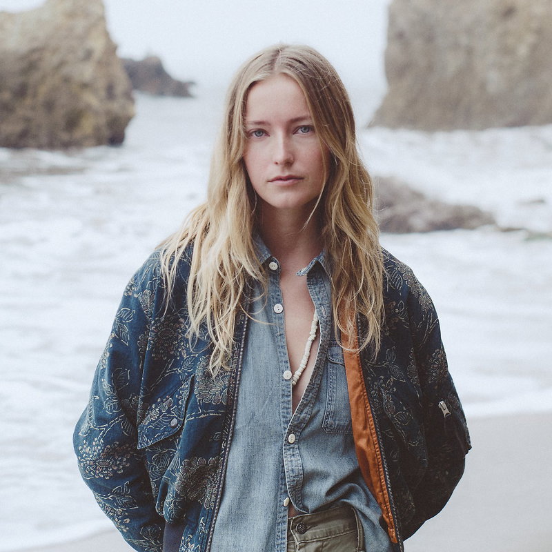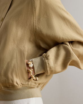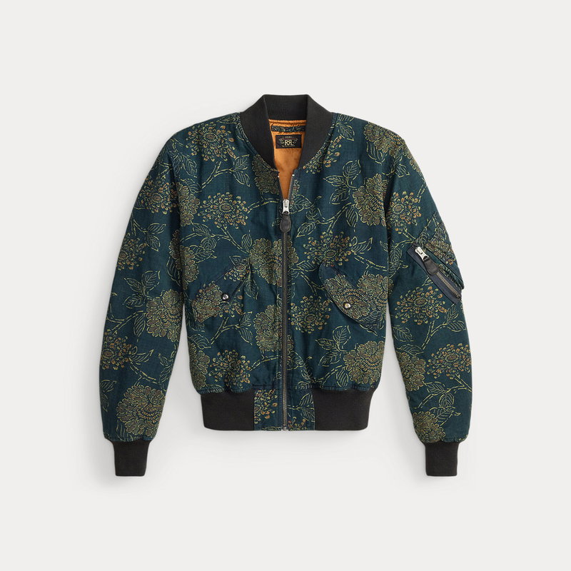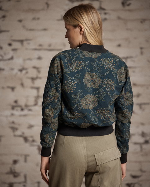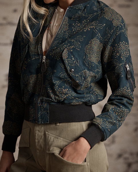 Flight jacket–inspired model. Made with linen-and-cotton cloth that features a rustic texture. Dyed with true indigo and discharge-printed with a floral motif. Ribbed collar, cuffs, and hem. Fully lined with faded orange satin.