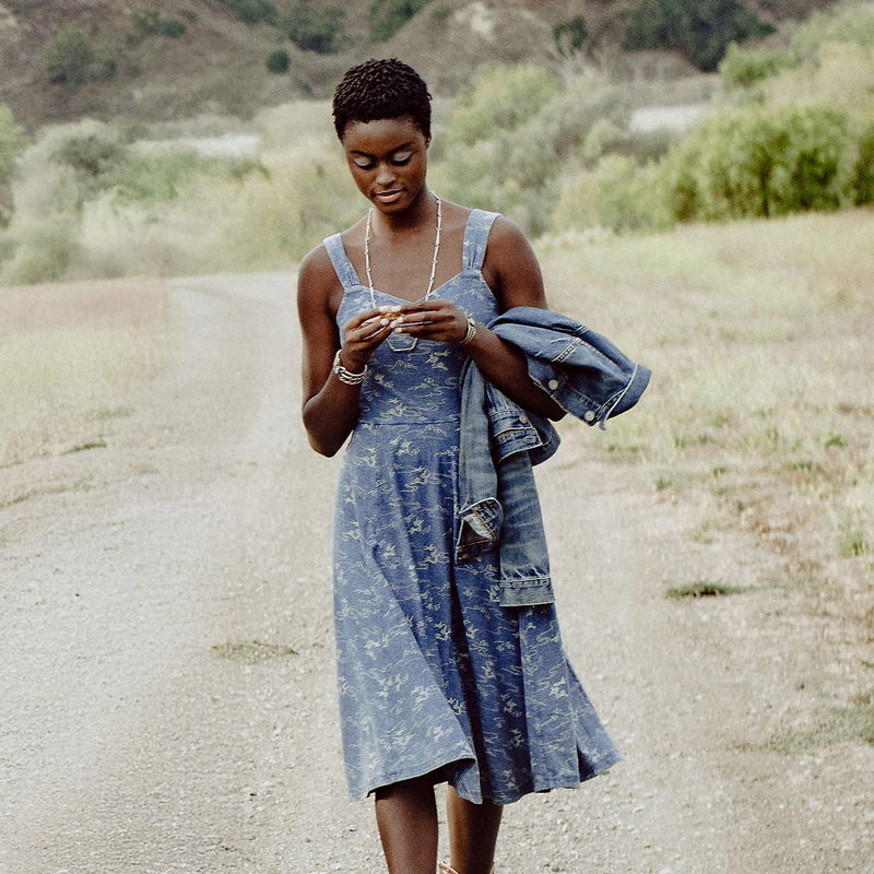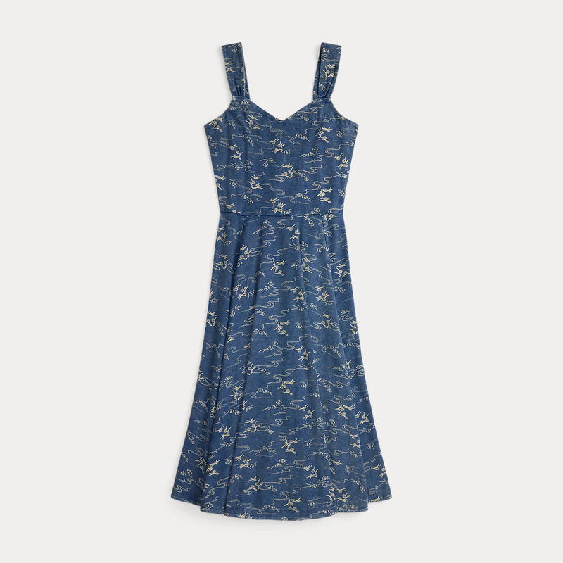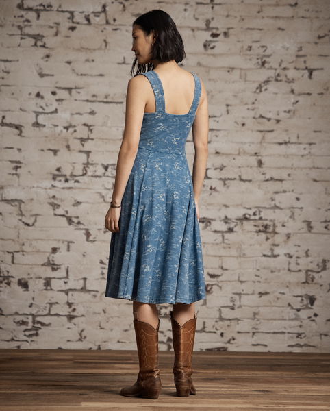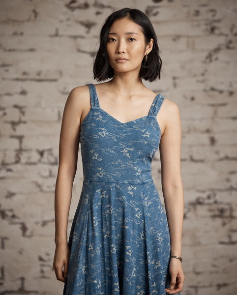 Made from cotton jersey. Dyed with true indigo and discharge-printed with a 19th century-inspired motif. Fitted bodice with a paneled skirt.