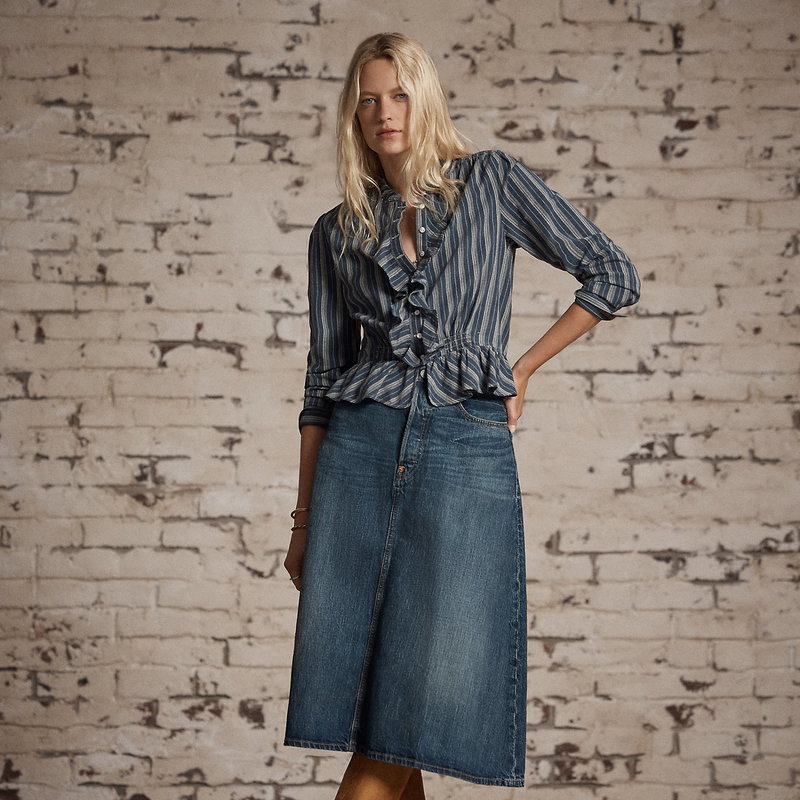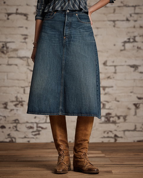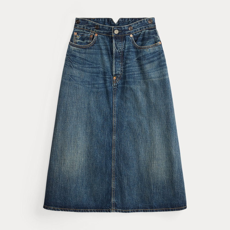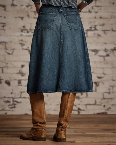 Calf-length skirt made from Double RL's most lightweight twill, which offers a substantial look. Japanese selvedge denim is dyed with true indigo. Yoke-over-body and split-back construction. Selvedge detailing on the waistband, coin pocket and adjustable buckled back. Copper-tone rivets.