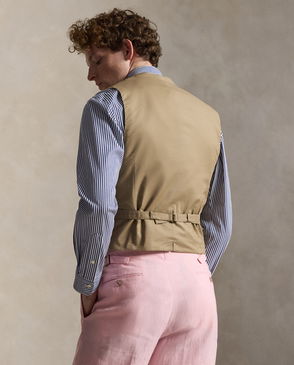 Notch-lapel waistcoat tailored in Italy. The linen-and-wool herringbone tweed was custom-developed with an Italian mill and features an ombré jaspé effect. Western-style pockets with triangular reinforcements. Adjustable buckled back. Fully lined. Genuine horn buttons.