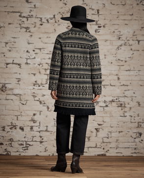 Duster cardigan made with wool and cotton yarns. Knitted using a birdseye-jacquard technique. Floral pattern based on an early 19th-century coverlet. Oversize shawl collar. Corozo buttons.