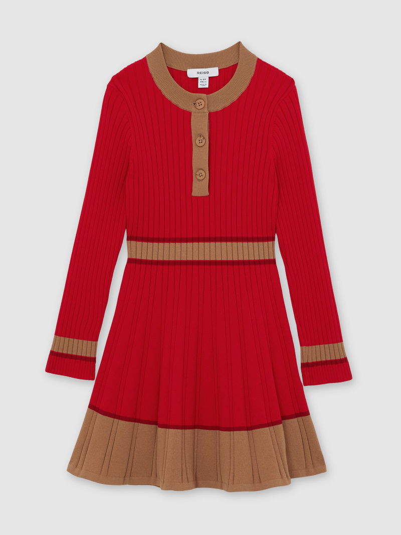 13-14 Yrs Colour-Block Knitted Skater Dress In Red
